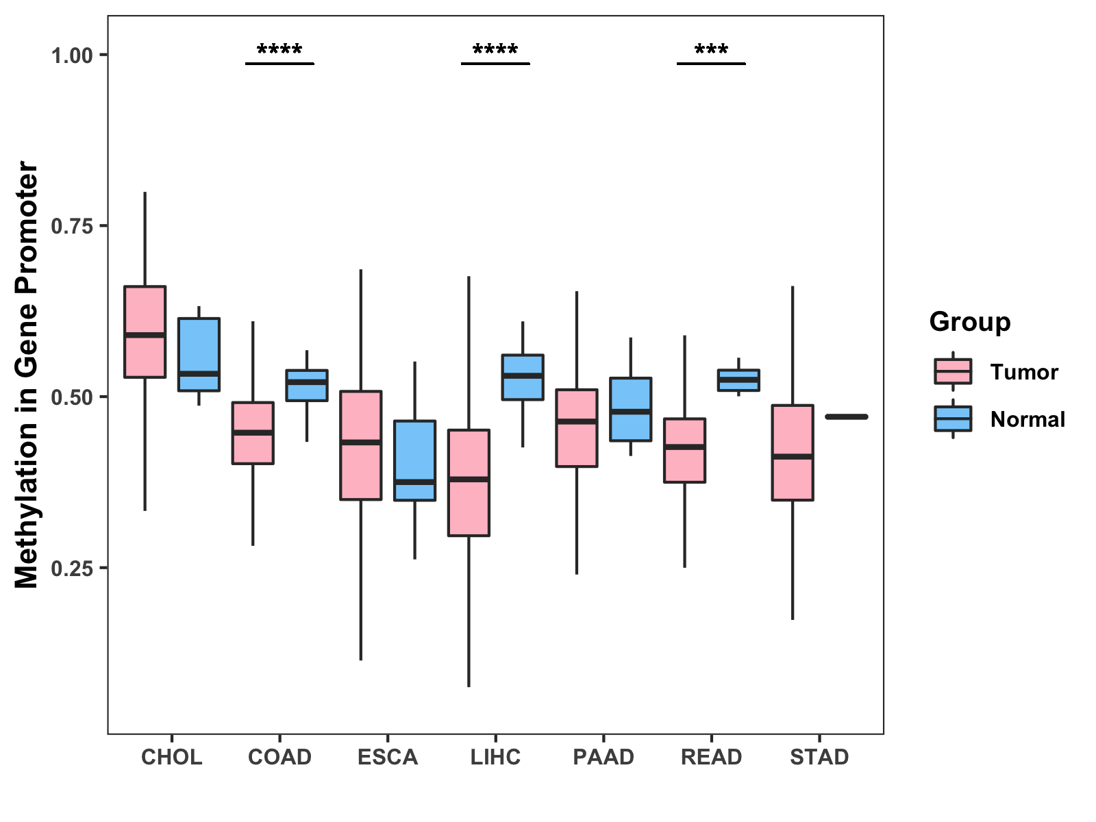 Boxplot of All Gastrointestinal Cancer ( * : 0.01-0.05 , ** : 0.005-0.01 , *** : 0.0001-0.005 , **** : < 0.0001 ) |