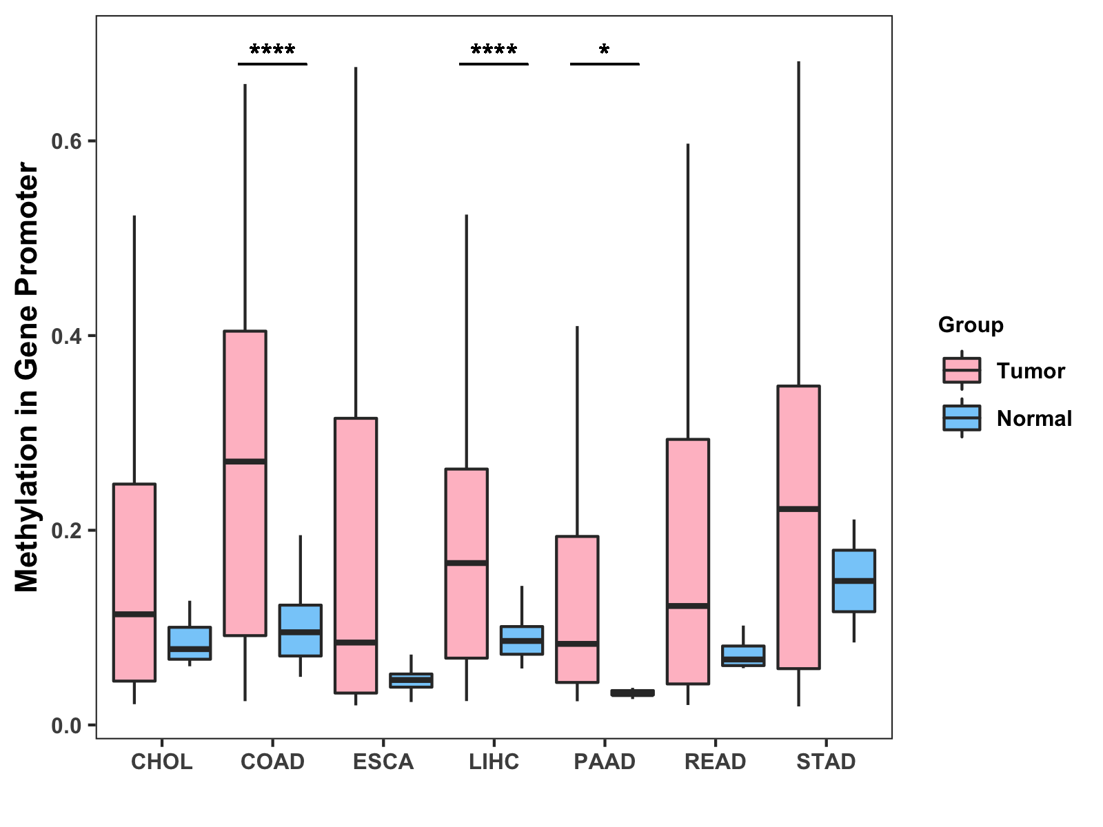Boxplot of All Gastrointestinal Cancer ( * : 0.01-0.05 , ** : 0.005-0.01 , *** : 0.0001-0.005 , **** : < 0.0001 ) |