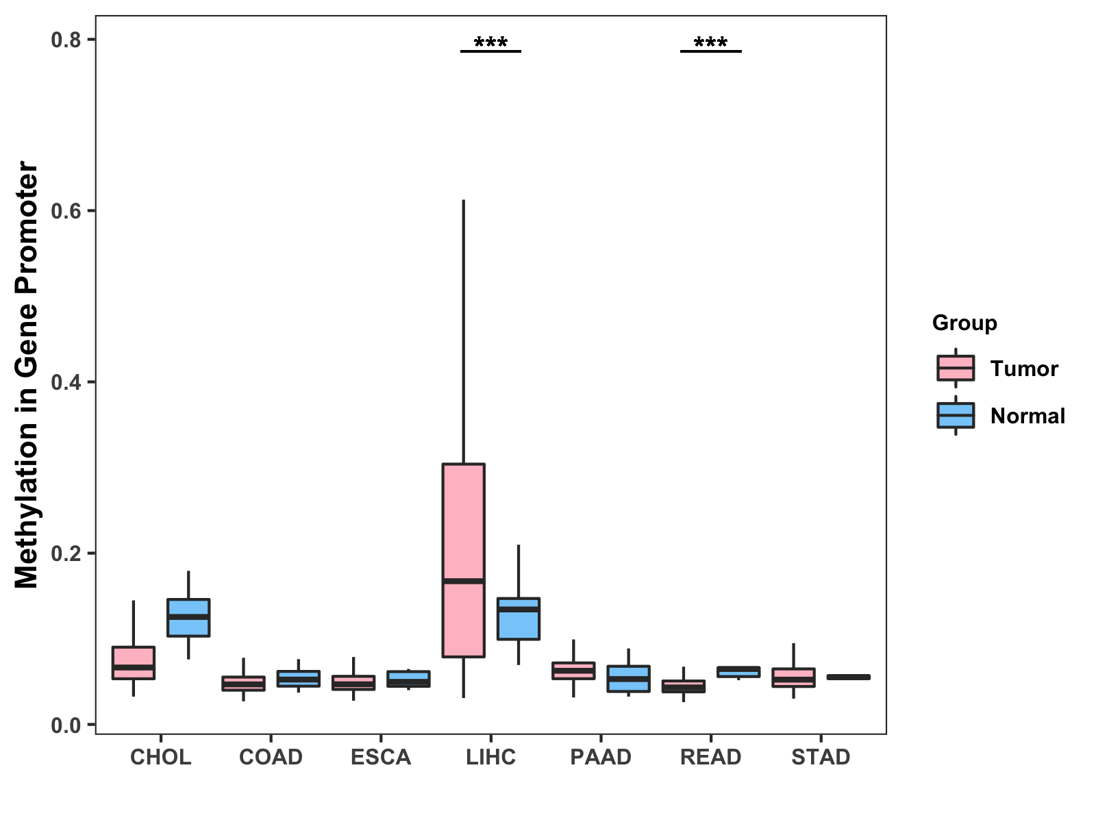 Boxplot of All Gastrointestinal Cancer ( * : 0.01-0.05 , ** : 0.005-0.01 , *** : 0.0001-0.005 , **** : < 0.0001 ) |