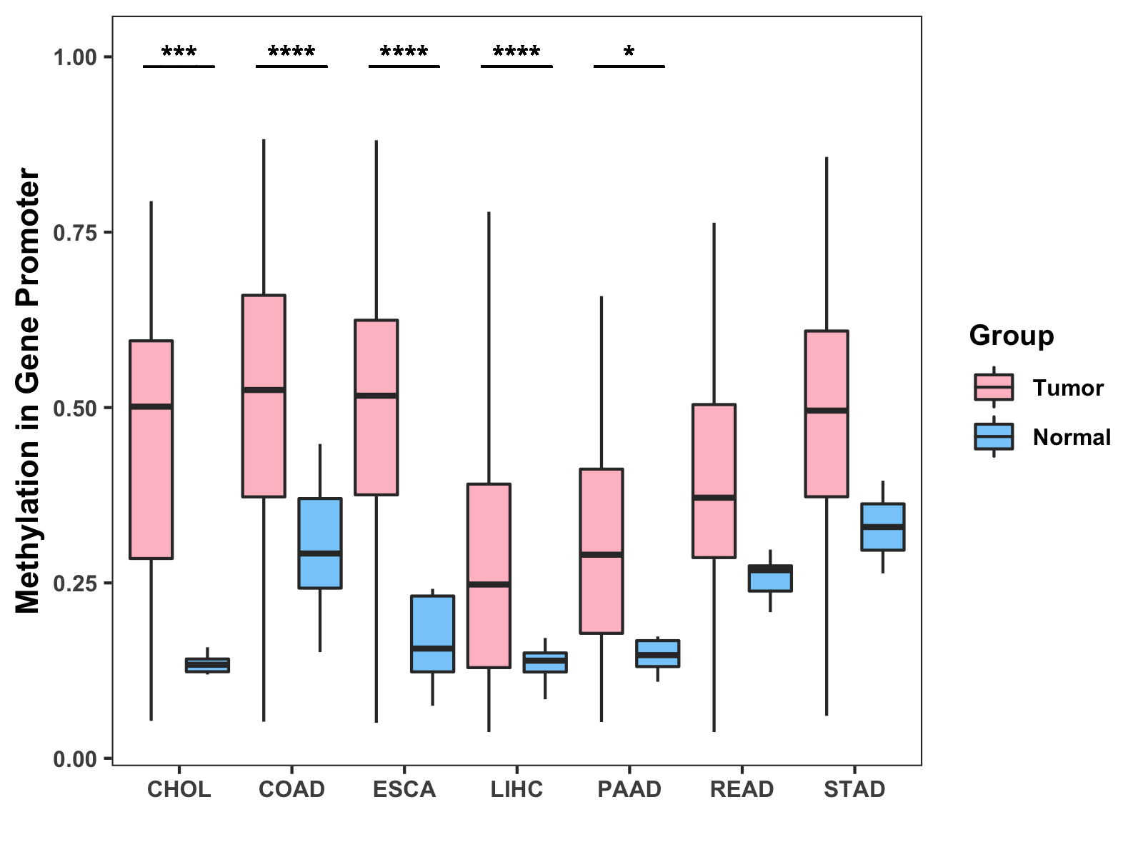 Boxplot of All Gastrointestinal Cancer ( * : 0.01-0.05 , ** : 0.005-0.01 , *** : 0.0001-0.005 , **** : < 0.0001 ) |