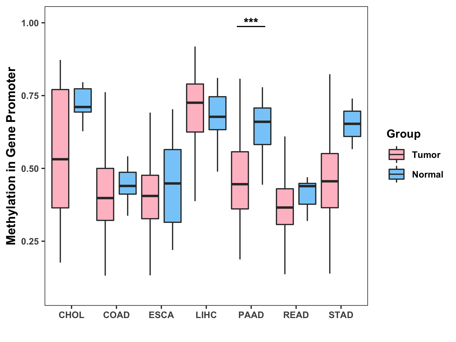 Boxplot of All Gastrointestinal Cancer ( * : 0.01-0.05 , ** : 0.005-0.01 , *** : 0.0001-0.005 , **** : < 0.0001 ) |