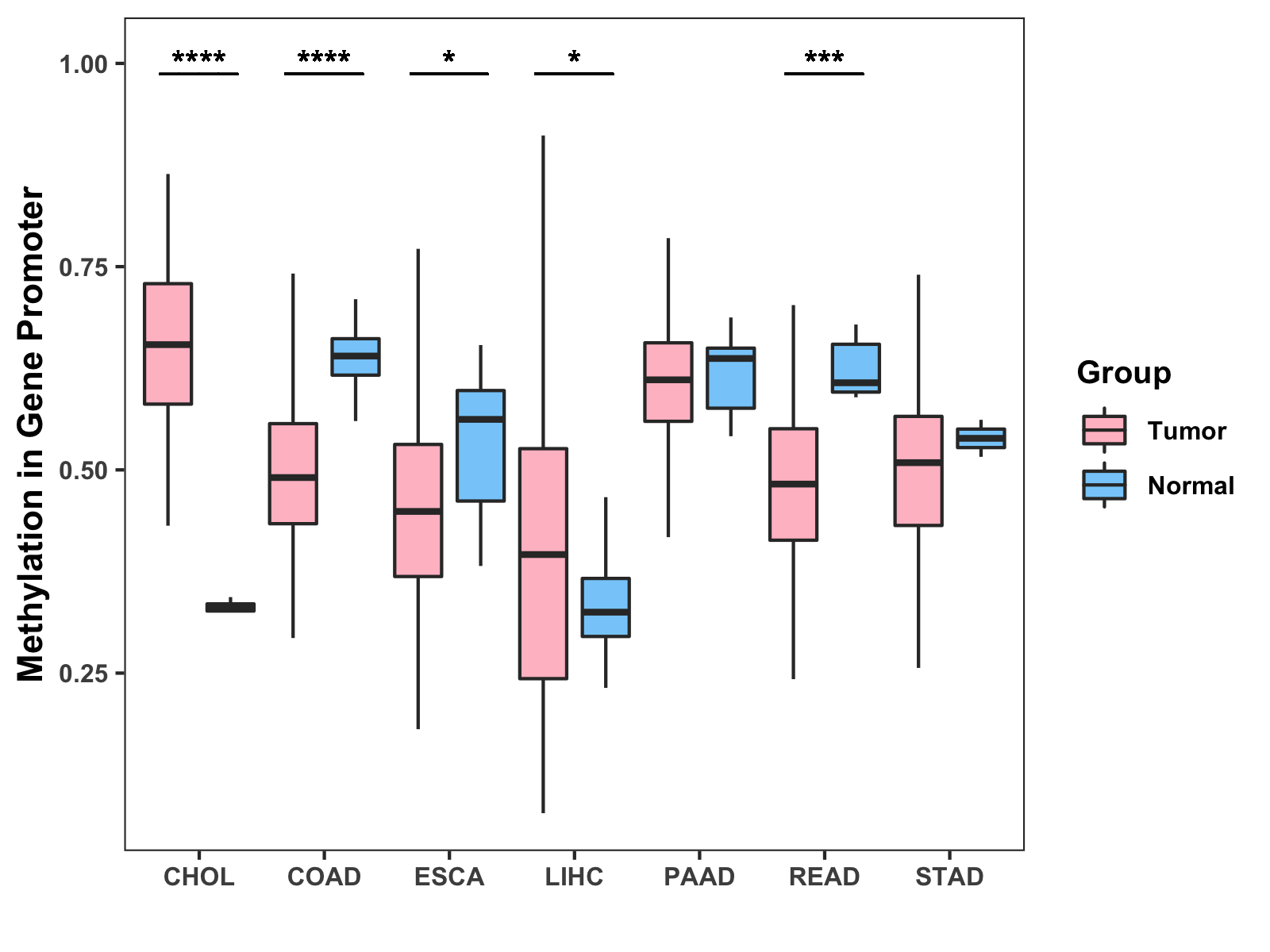 Boxplot of All Gastrointestinal Cancer ( * : 0.01-0.05 , ** : 0.005-0.01 , *** : 0.0001-0.005 , **** : < 0.0001 ) |