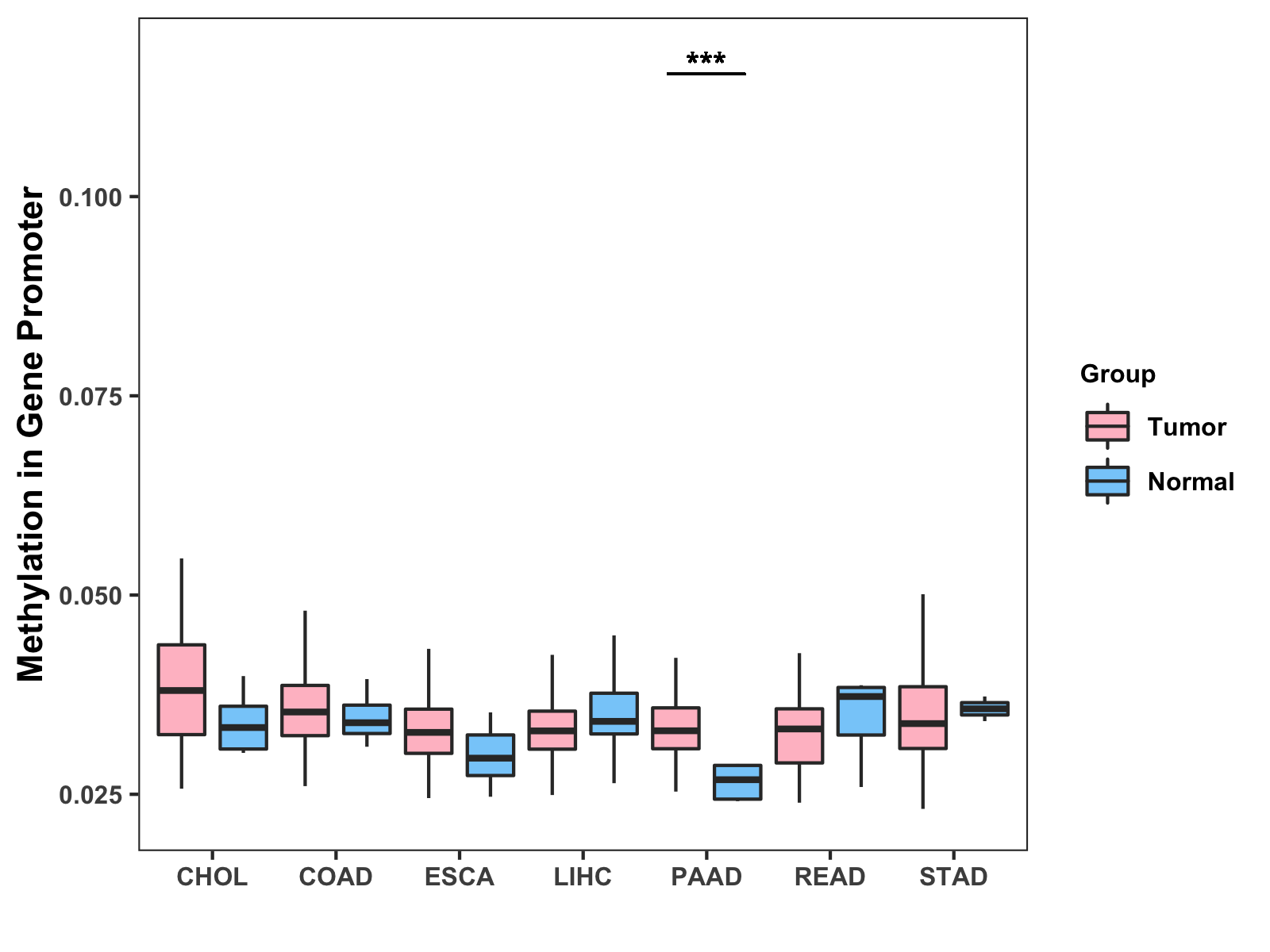 Boxplot of All Gastrointestinal Cancer ( * : 0.01-0.05 , ** : 0.005-0.01 , *** : 0.0001-0.005 , **** : < 0.0001 ) |