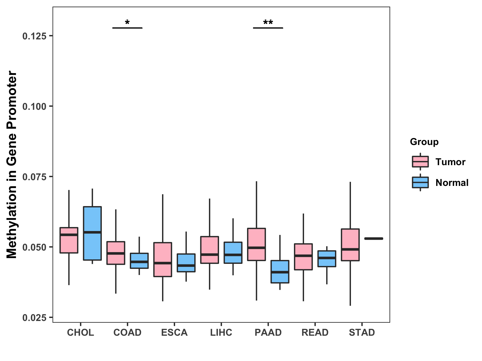 Boxplot of All Gastrointestinal Cancer ( * : 0.01-0.05 , ** : 0.005-0.01 , *** : 0.0001-0.005 , **** : < 0.0001 ) |