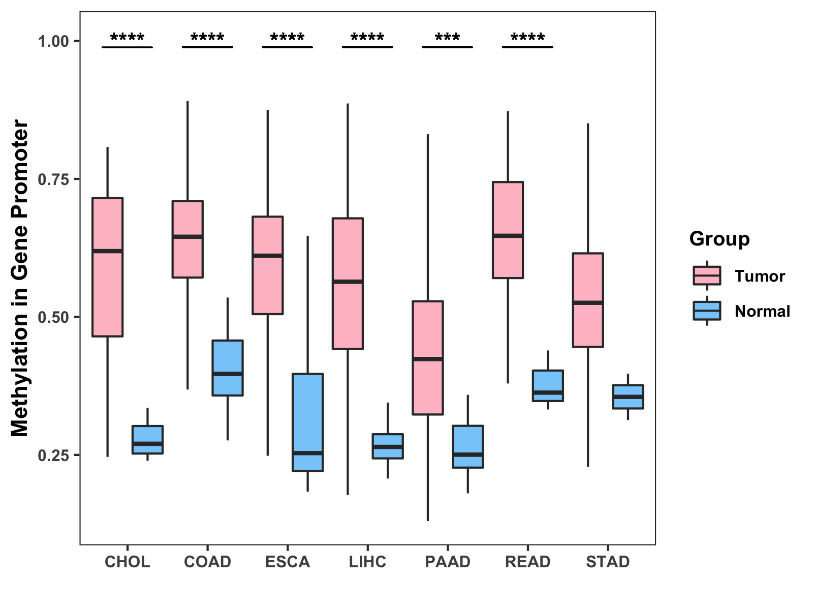 Boxplot of All Gastrointestinal Cancer ( * : 0.01-0.05 , ** : 0.005-0.01 , *** : 0.0001-0.005 , **** : < 0.0001 ) |