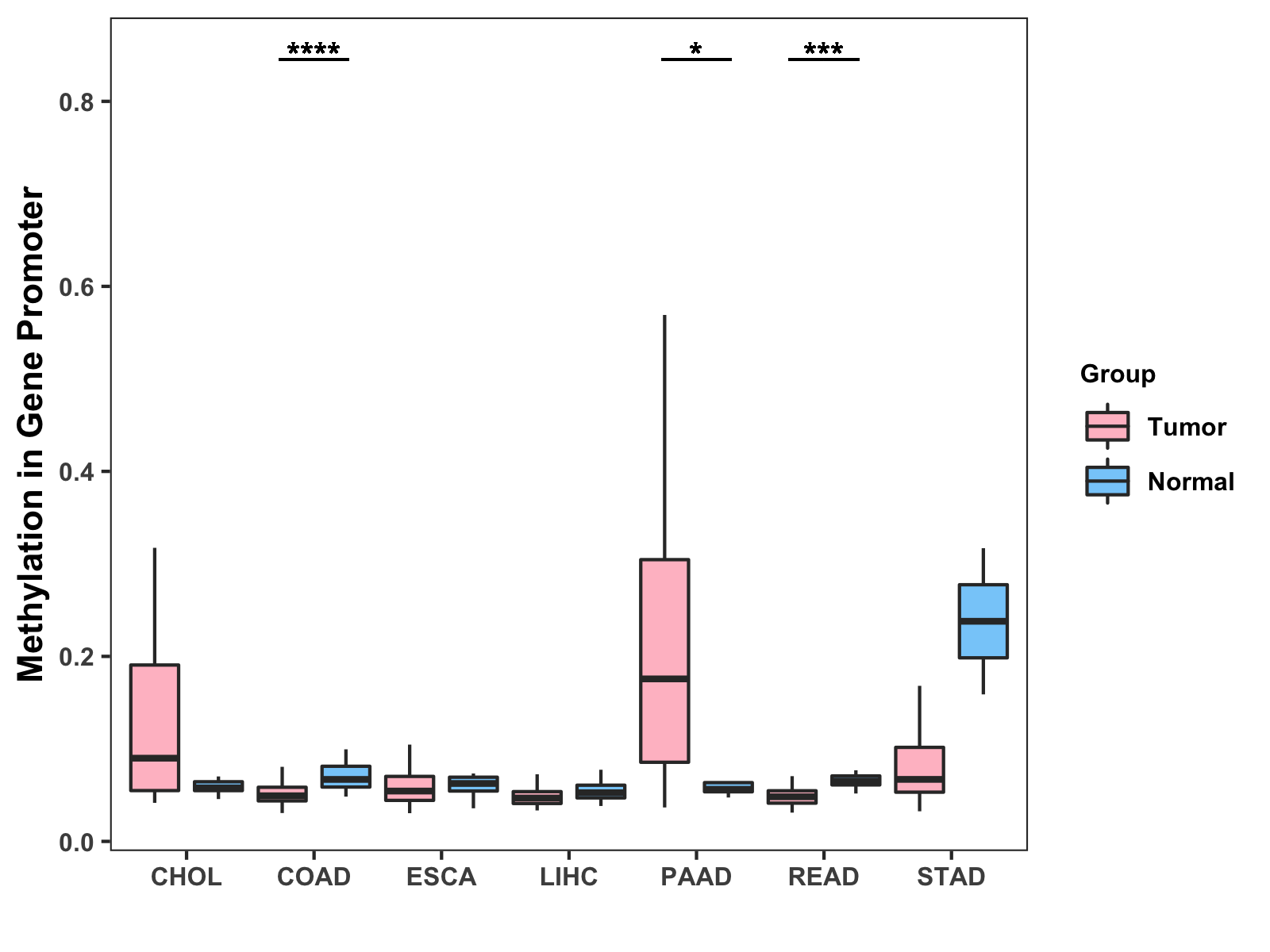 Boxplot of All Gastrointestinal Cancer ( * : 0.01-0.05 , ** : 0.005-0.01 , *** : 0.0001-0.005 , **** : < 0.0001 ) |