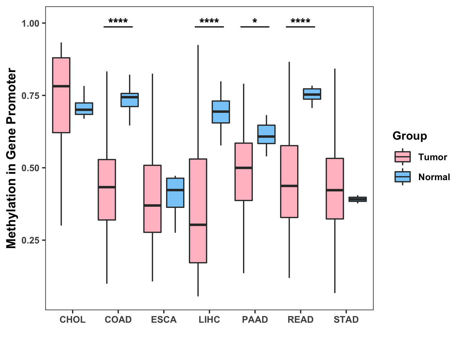 Boxplot of All Gastrointestinal Cancer ( * : 0.01-0.05 , ** : 0.005-0.01 , *** : 0.0001-0.005 , **** : < 0.0001 ) |