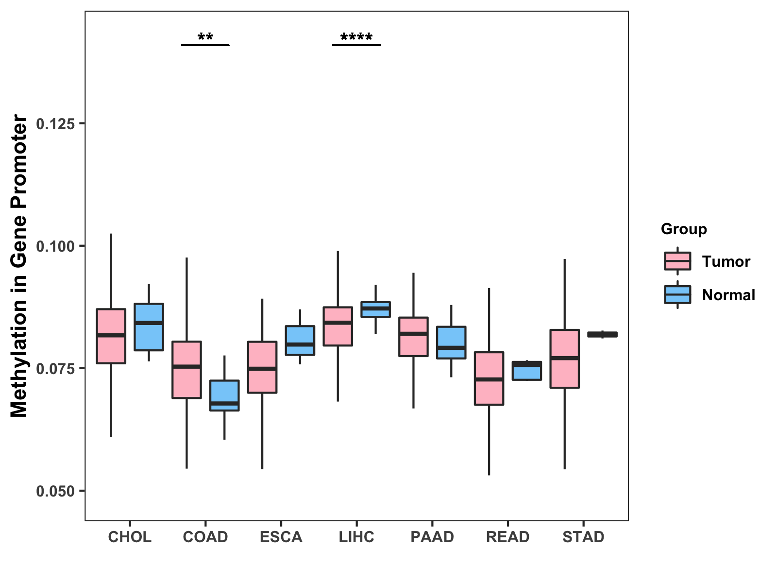 Boxplot of All Gastrointestinal Cancer ( * : 0.01-0.05 , ** : 0.005-0.01 , *** : 0.0001-0.005 , **** : < 0.0001 ) |