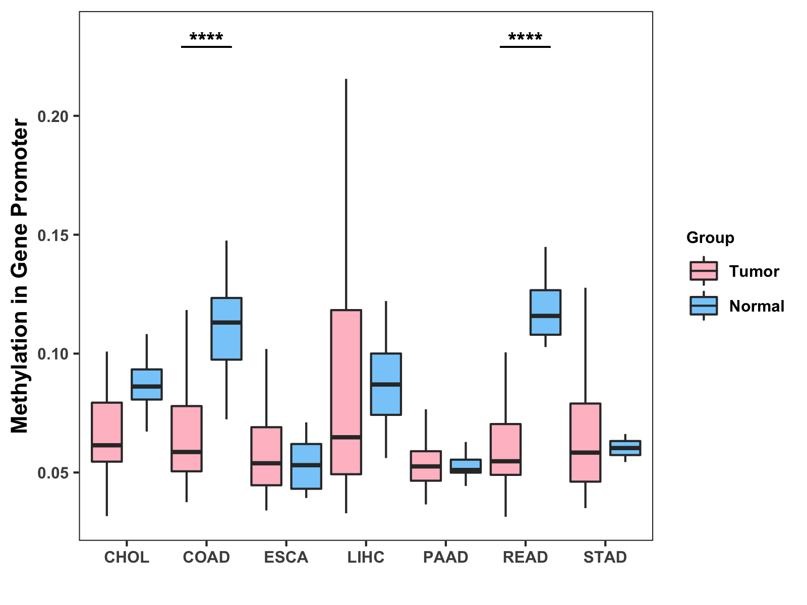 Boxplot of All Gastrointestinal Cancer ( * : 0.01-0.05 , ** : 0.005-0.01 , *** : 0.0001-0.005 , **** : < 0.0001 ) |