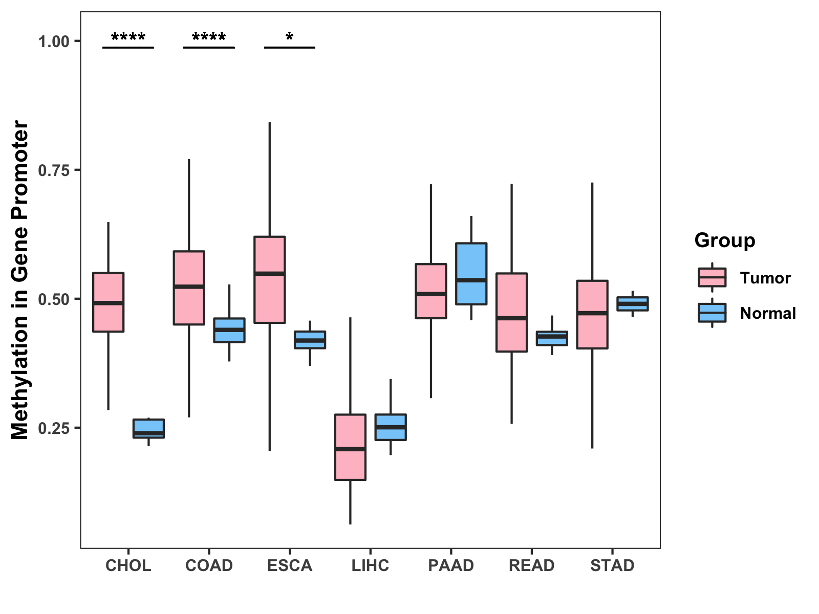Boxplot of All Gastrointestinal Cancer ( * : 0.01-0.05 , ** : 0.005-0.01 , *** : 0.0001-0.005 , **** : < 0.0001 ) |