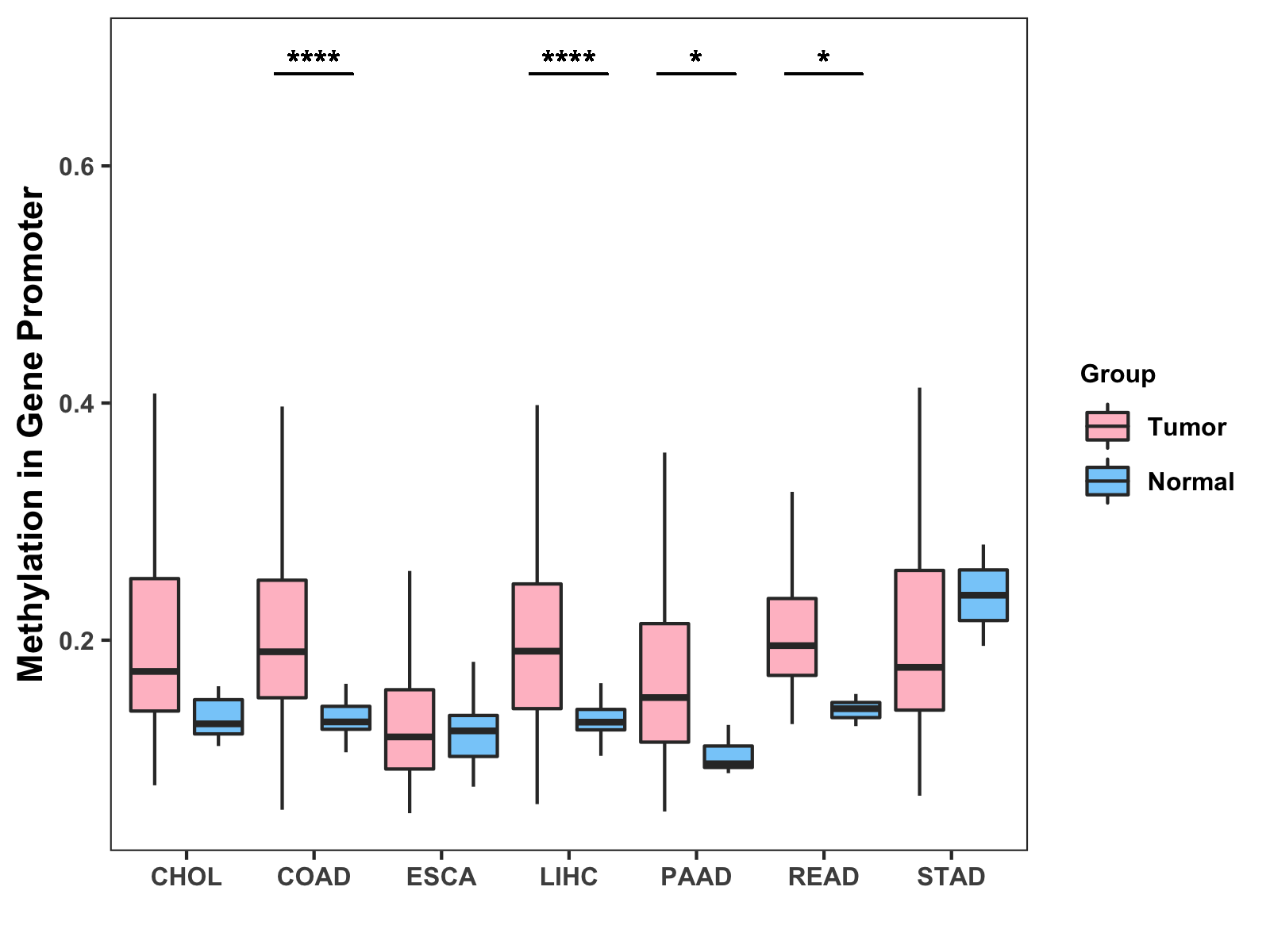 Boxplot of All Gastrointestinal Cancer ( * : 0.01-0.05 , ** : 0.005-0.01 , *** : 0.0001-0.005 , **** : < 0.0001 ) |