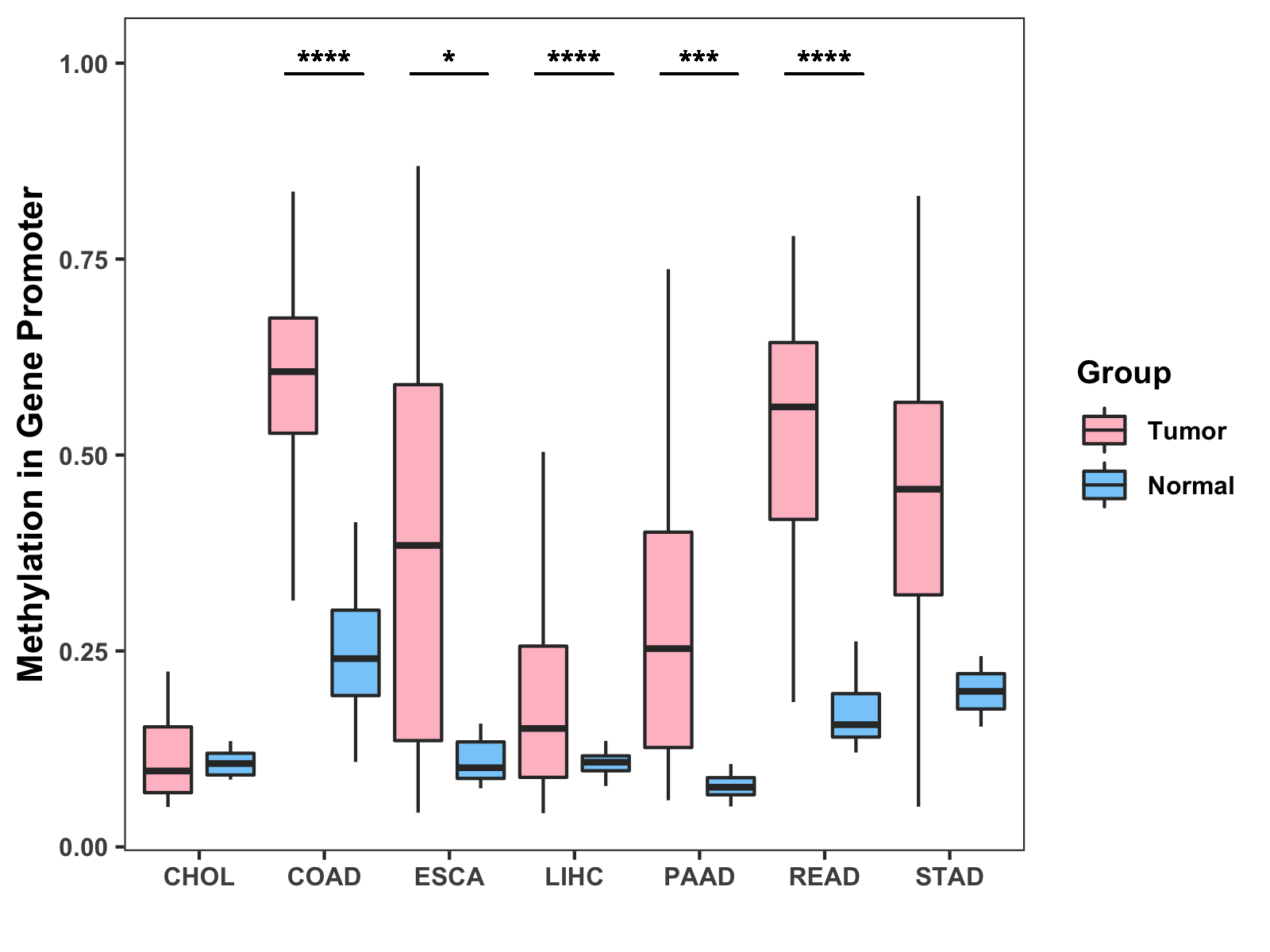 Boxplot of All Gastrointestinal Cancer ( * : 0.01-0.05 , ** : 0.005-0.01 , *** : 0.0001-0.005 , **** : < 0.0001 ) |