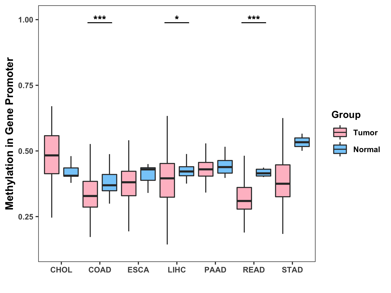 Boxplot of All Gastrointestinal Cancer ( * : 0.01-0.05 , ** : 0.005-0.01 , *** : 0.0001-0.005 , **** : < 0.0001 ) |