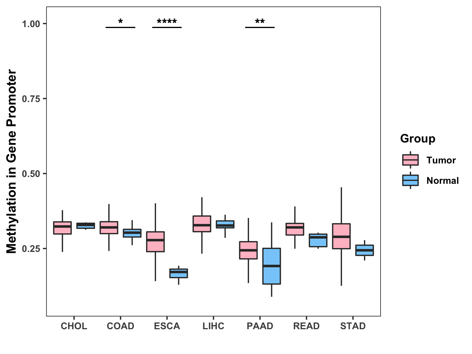 Boxplot of All Gastrointestinal Cancer ( * : 0.01-0.05 , ** : 0.005-0.01 , *** : 0.0001-0.005 , **** : < 0.0001 ) |