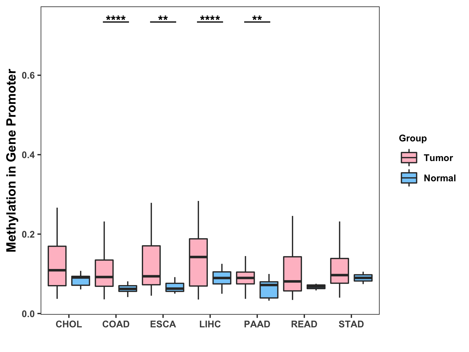 Boxplot of All Gastrointestinal Cancer ( * : 0.01-0.05 , ** : 0.005-0.01 , *** : 0.0001-0.005 , **** : < 0.0001 ) |