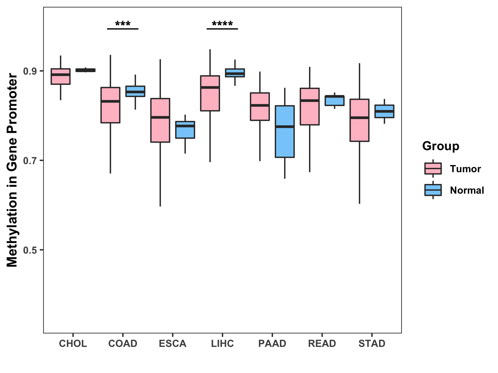 Boxplot of All Gastrointestinal Cancer ( * : 0.01-0.05 , ** : 0.005-0.01 , *** : 0.0001-0.005 , **** : < 0.0001 ) |