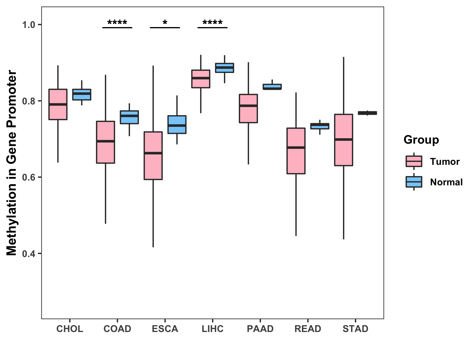 Boxplot of All Gastrointestinal Cancer ( * : 0.01-0.05 , ** : 0.005-0.01 , *** : 0.0001-0.005 , **** : < 0.0001 ) |