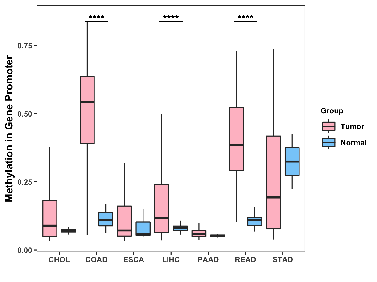 Boxplot of All Gastrointestinal Cancer ( * : 0.01-0.05 , ** : 0.005-0.01 , *** : 0.0001-0.005 , **** : < 0.0001 ) |