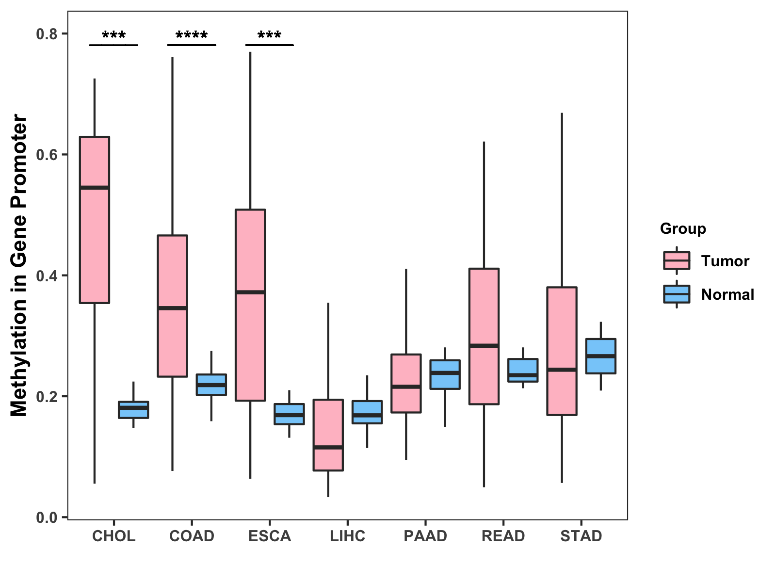 Boxplot of All Gastrointestinal Cancer ( * : 0.01-0.05 , ** : 0.005-0.01 , *** : 0.0001-0.005 , **** : < 0.0001 ) |