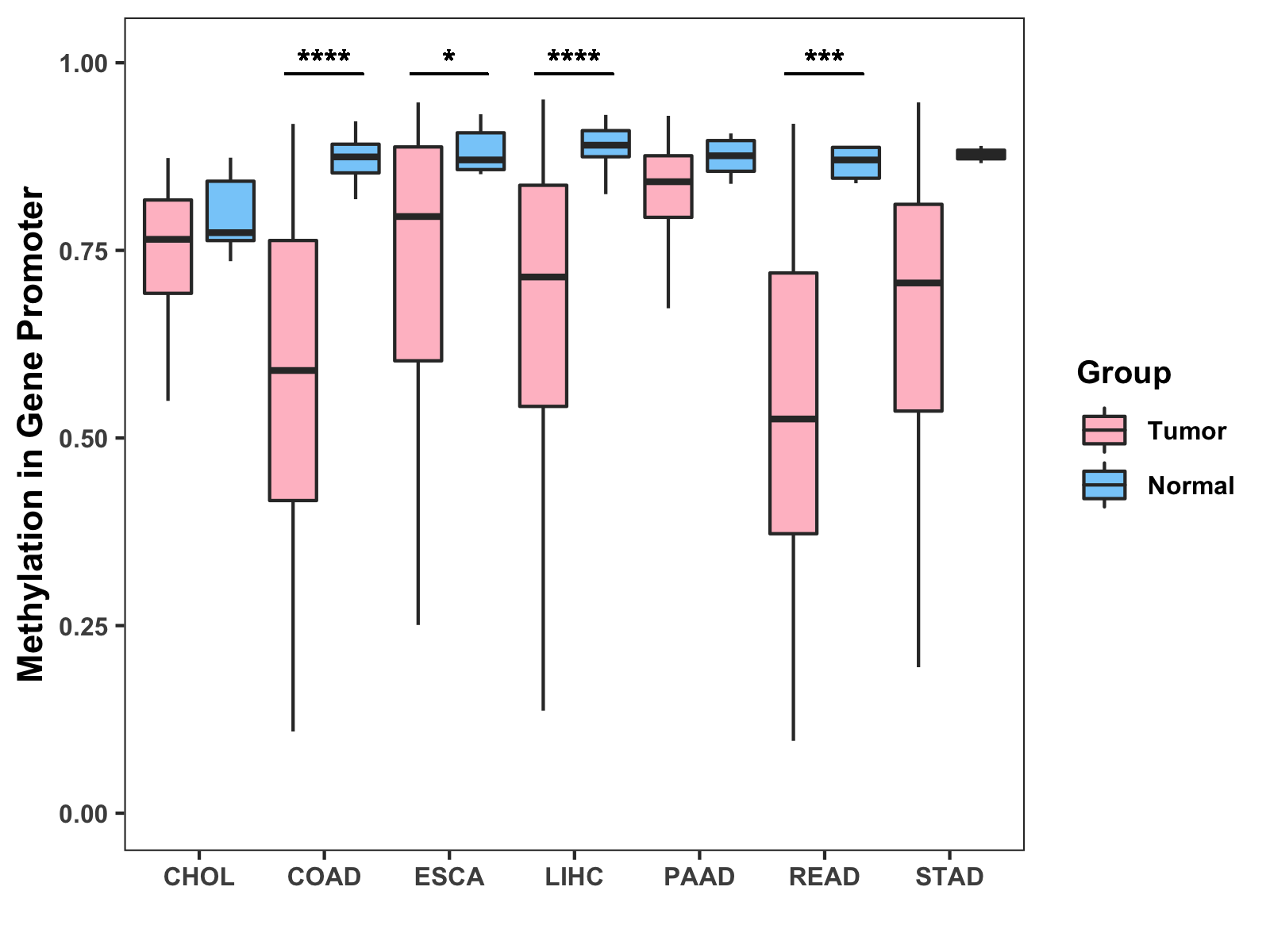 Boxplot of All Gastrointestinal Cancer ( * : 0.01-0.05 , ** : 0.005-0.01 , *** : 0.0001-0.005 , **** : < 0.0001 ) |