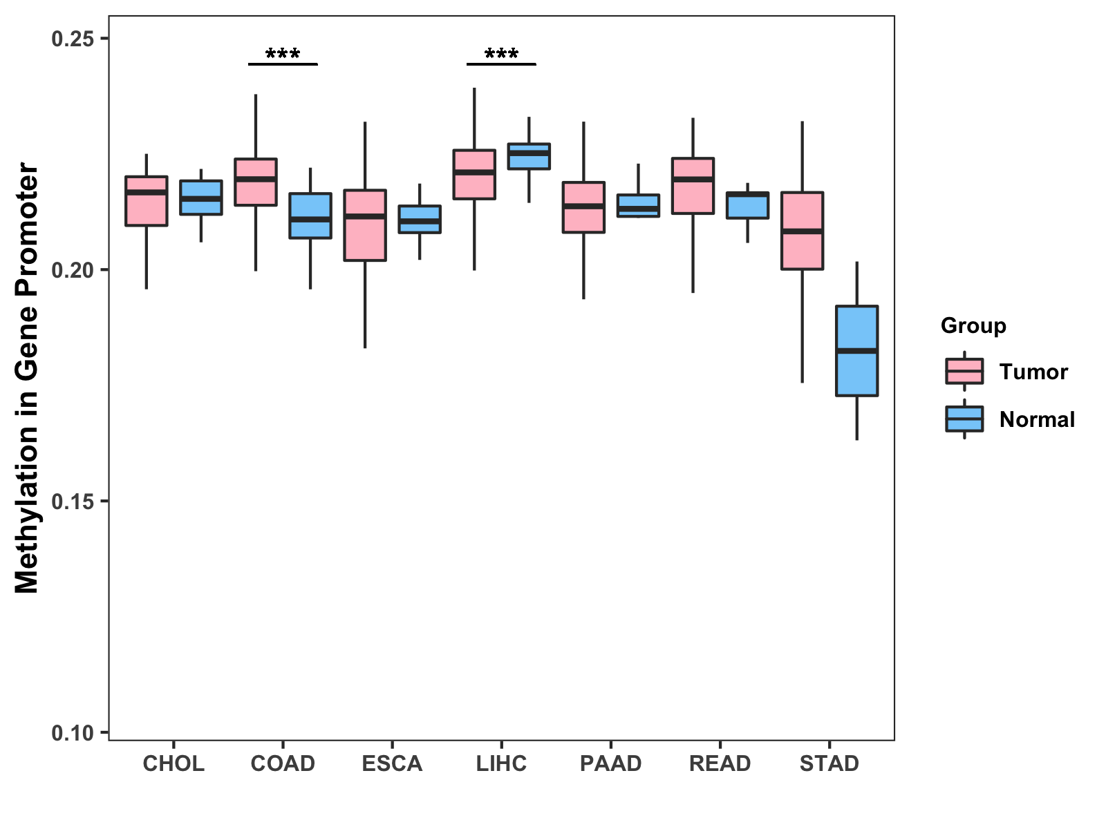 Boxplot of All Gastrointestinal Cancer ( * : 0.01-0.05 , ** : 0.005-0.01 , *** : 0.0001-0.005 , **** : < 0.0001 ) |