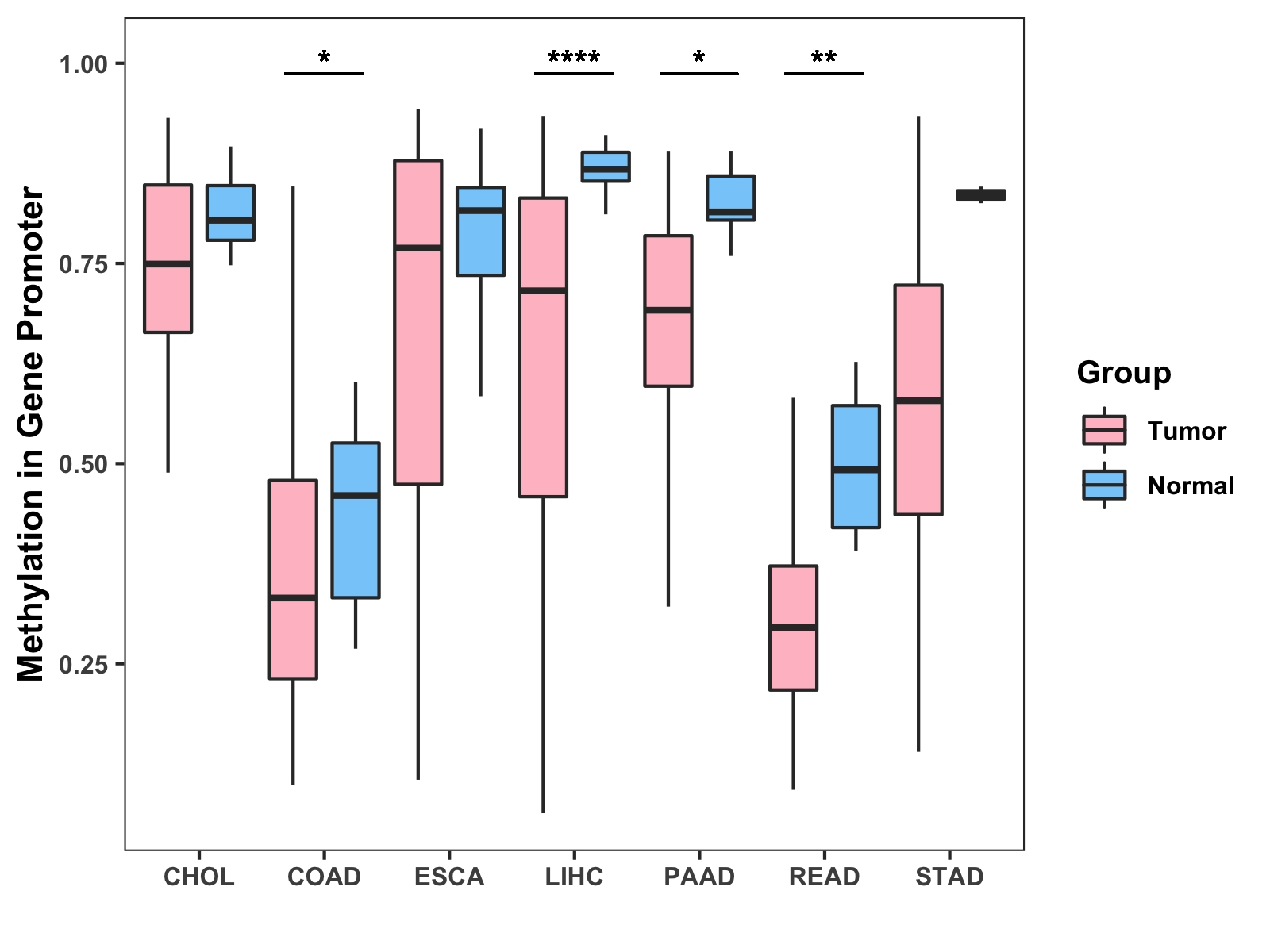 Boxplot of All Gastrointestinal Cancer ( * : 0.01-0.05 , ** : 0.005-0.01 , *** : 0.0001-0.005 , **** : < 0.0001 ) |