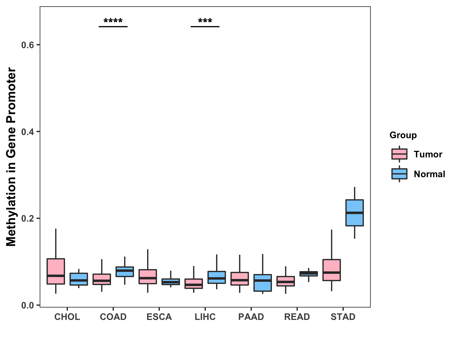 Boxplot of All Gastrointestinal Cancer ( * : 0.01-0.05 , ** : 0.005-0.01 , *** : 0.0001-0.005 , **** : < 0.0001 ) |