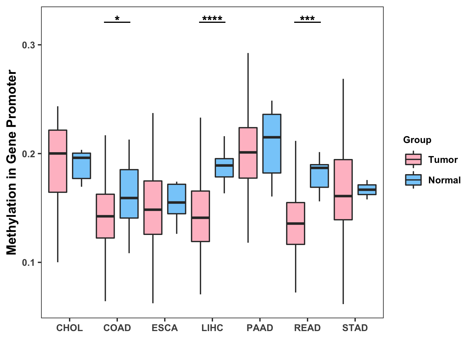 Boxplot of All Gastrointestinal Cancer ( * : 0.01-0.05 , ** : 0.005-0.01 , *** : 0.0001-0.005 , **** : < 0.0001 ) |