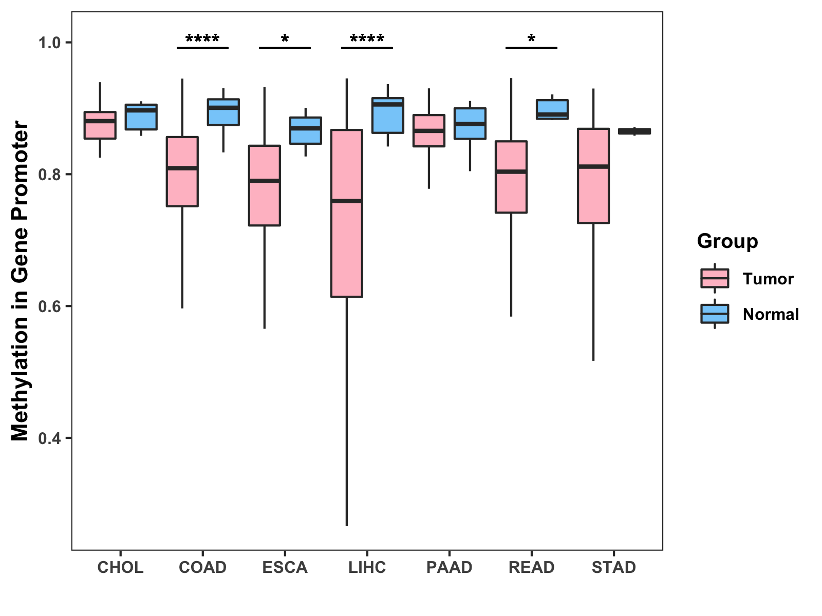 Boxplot of All Gastrointestinal Cancer ( * : 0.01-0.05 , ** : 0.005-0.01 , *** : 0.0001-0.005 , **** : < 0.0001 ) |