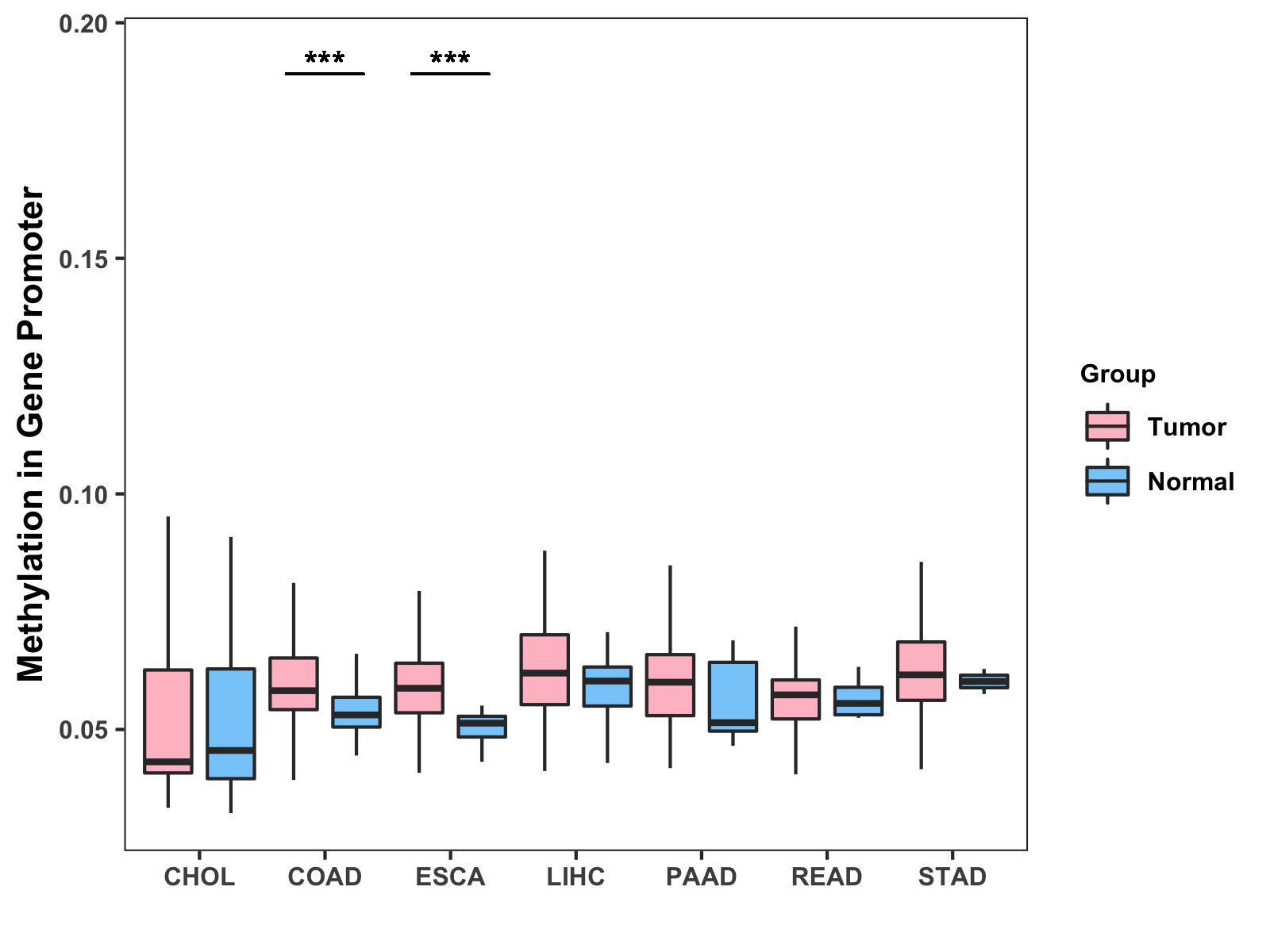 Boxplot of All Gastrointestinal Cancer ( * : 0.01-0.05 , ** : 0.005-0.01 , *** : 0.0001-0.005 , **** : < 0.0001 ) |