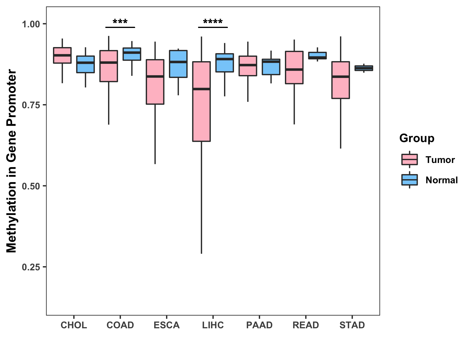 Boxplot of All Gastrointestinal Cancer ( * : 0.01-0.05 , ** : 0.005-0.01 , *** : 0.0001-0.005 , **** : < 0.0001 ) |