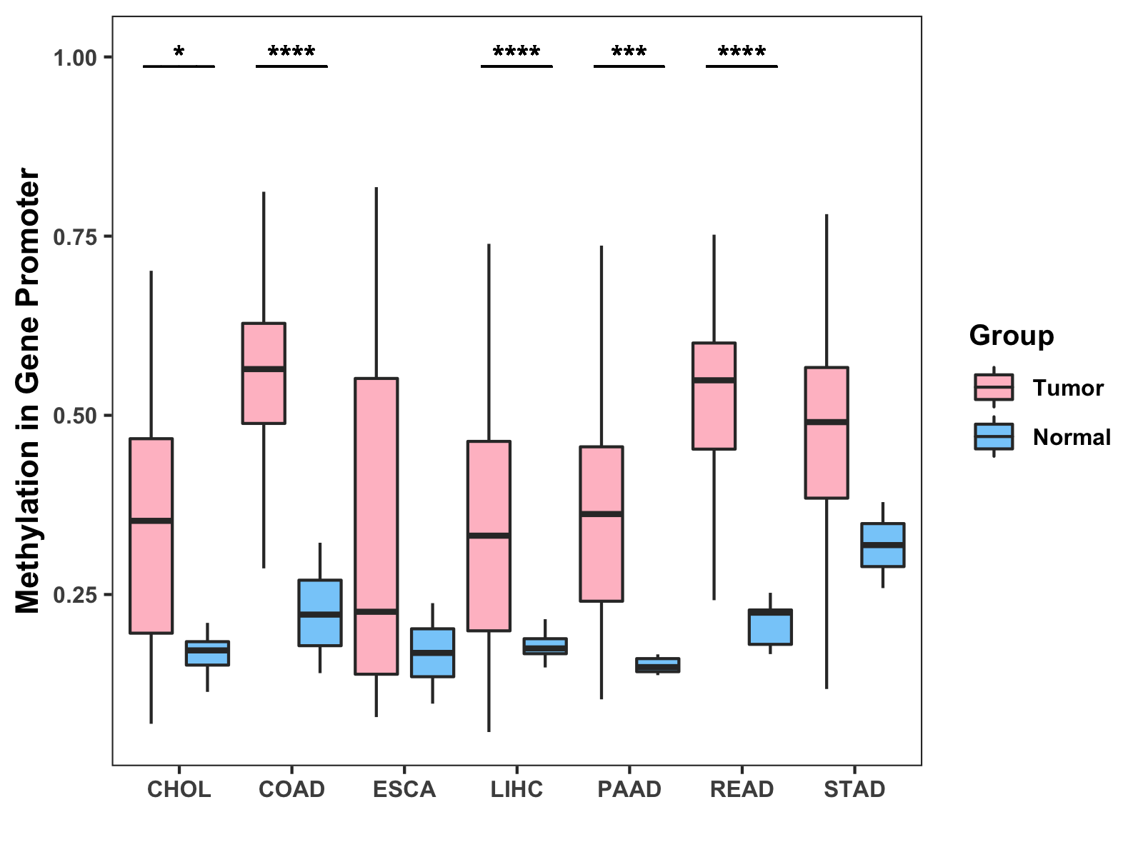 Boxplot of All Gastrointestinal Cancer ( * : 0.01-0.05 , ** : 0.005-0.01 , *** : 0.0001-0.005 , **** : < 0.0001 ) |