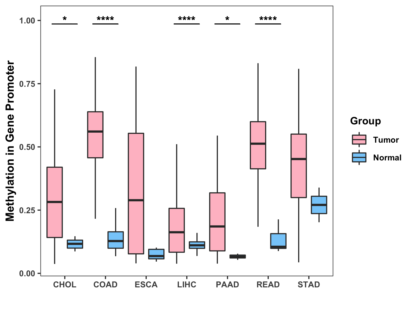 Boxplot of All Gastrointestinal Cancer ( * : 0.01-0.05 , ** : 0.005-0.01 , *** : 0.0001-0.005 , **** : < 0.0001 ) |