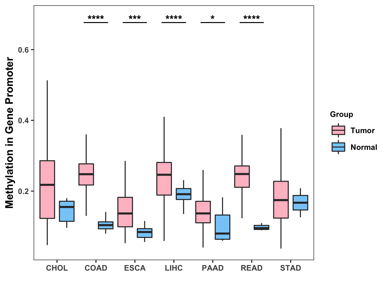 Boxplot of All Gastrointestinal Cancer ( * : 0.01-0.05 , ** : 0.005-0.01 , *** : 0.0001-0.005 , **** : < 0.0001 ) |