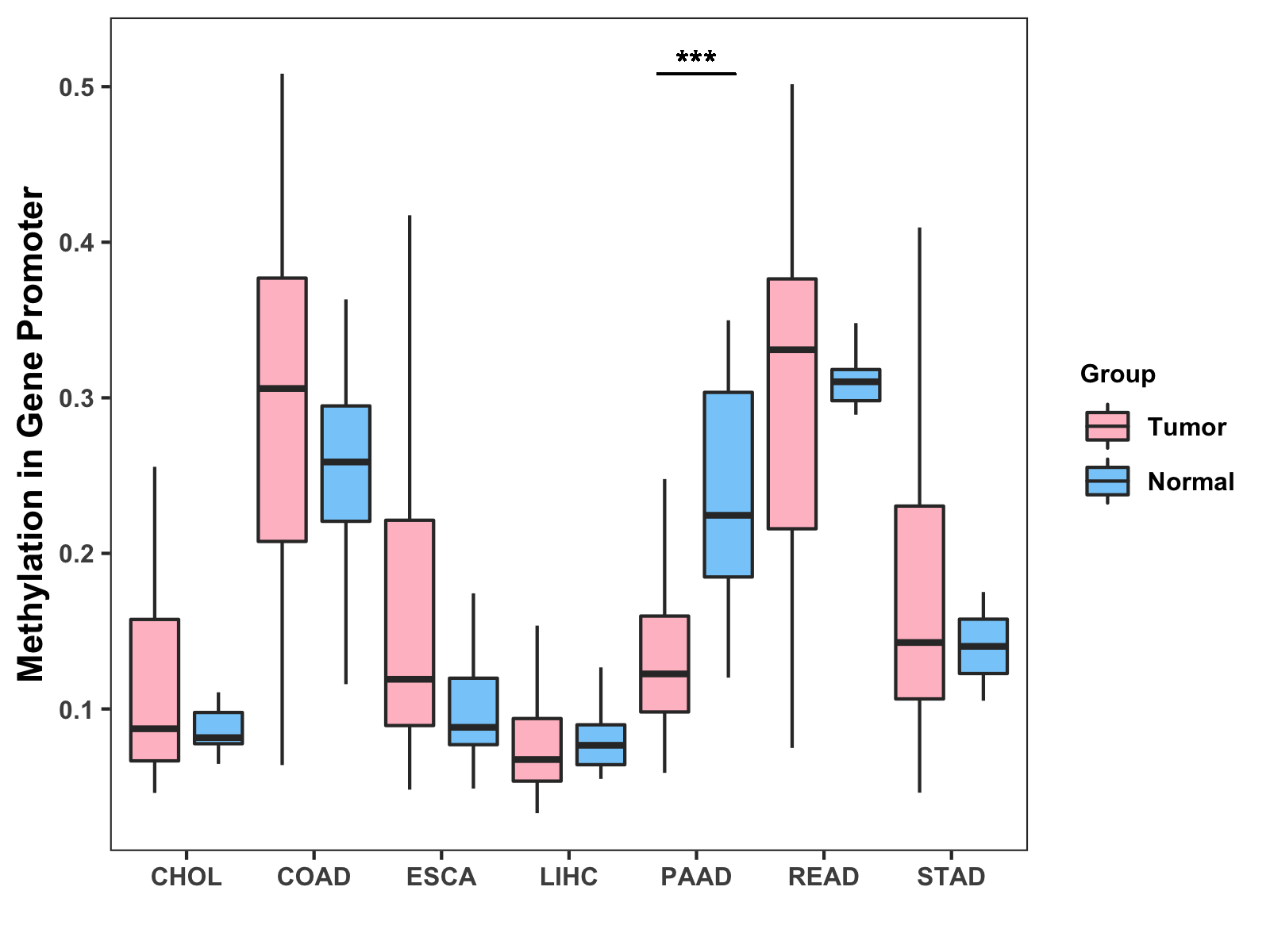 Boxplot of All Gastrointestinal Cancer ( * : 0.01-0.05 , ** : 0.005-0.01 , *** : 0.0001-0.005 , **** : < 0.0001 ) |