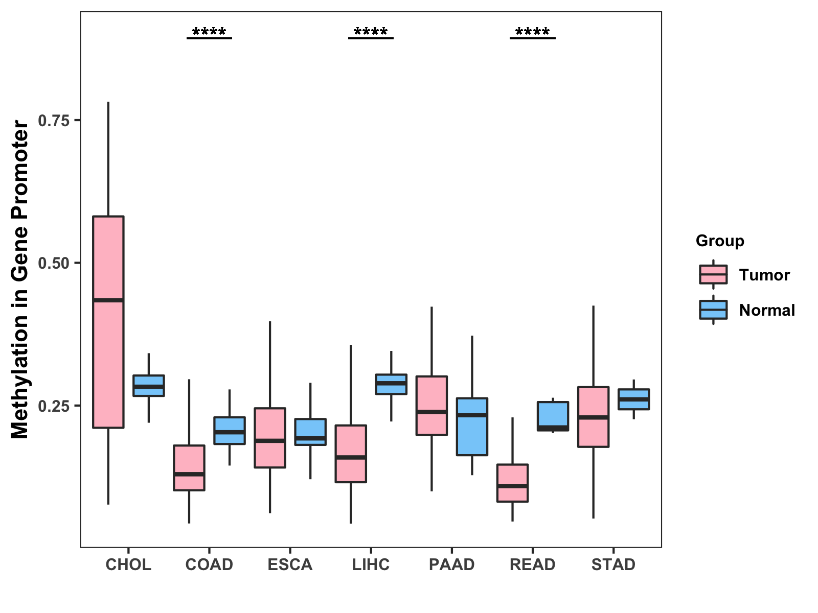 Boxplot of All Gastrointestinal Cancer ( * : 0.01-0.05 , ** : 0.005-0.01 , *** : 0.0001-0.005 , **** : < 0.0001 ) |