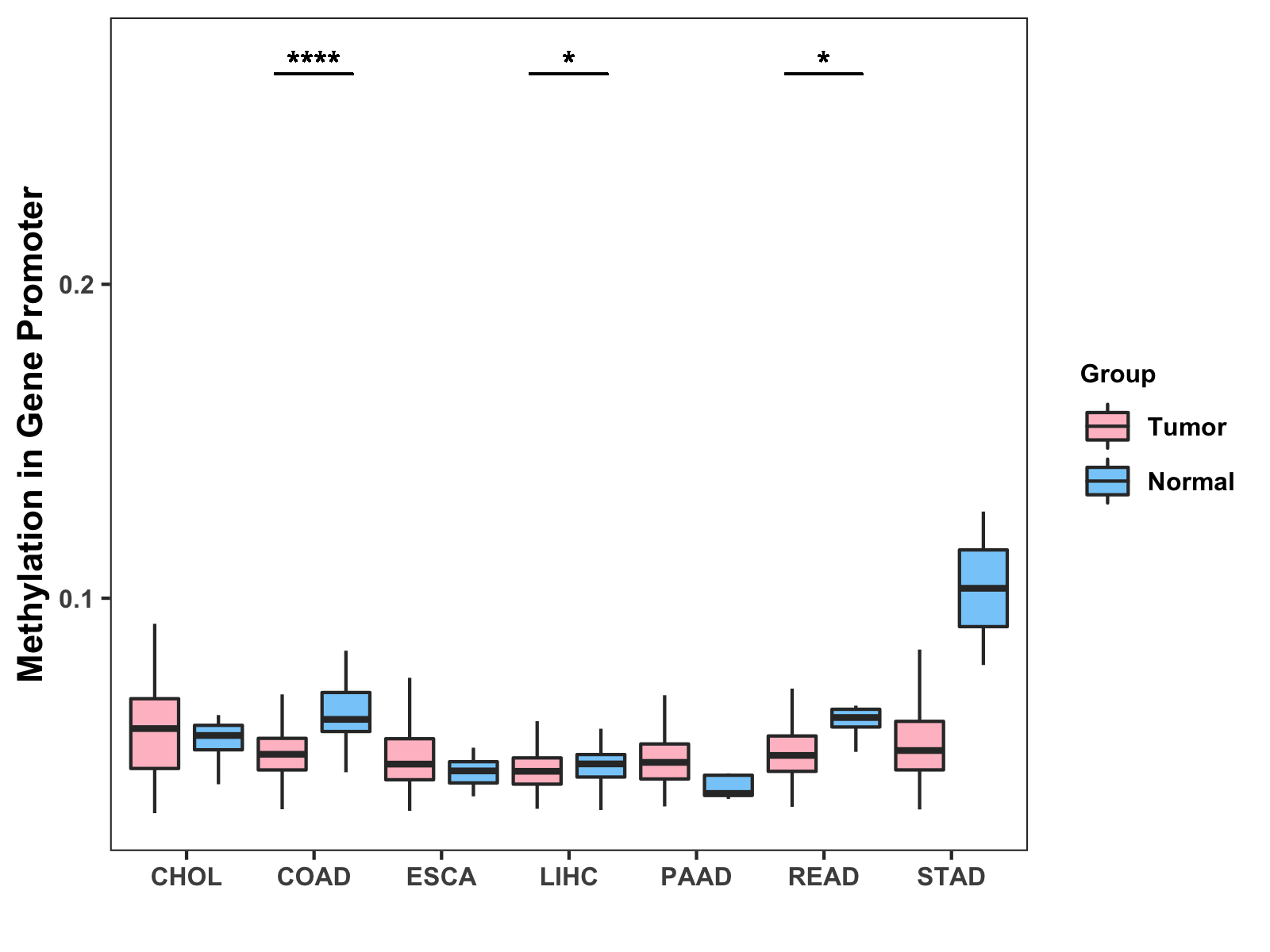 Boxplot of All Gastrointestinal Cancer ( * : 0.01-0.05 , ** : 0.005-0.01 , *** : 0.0001-0.005 , **** : < 0.0001 ) |