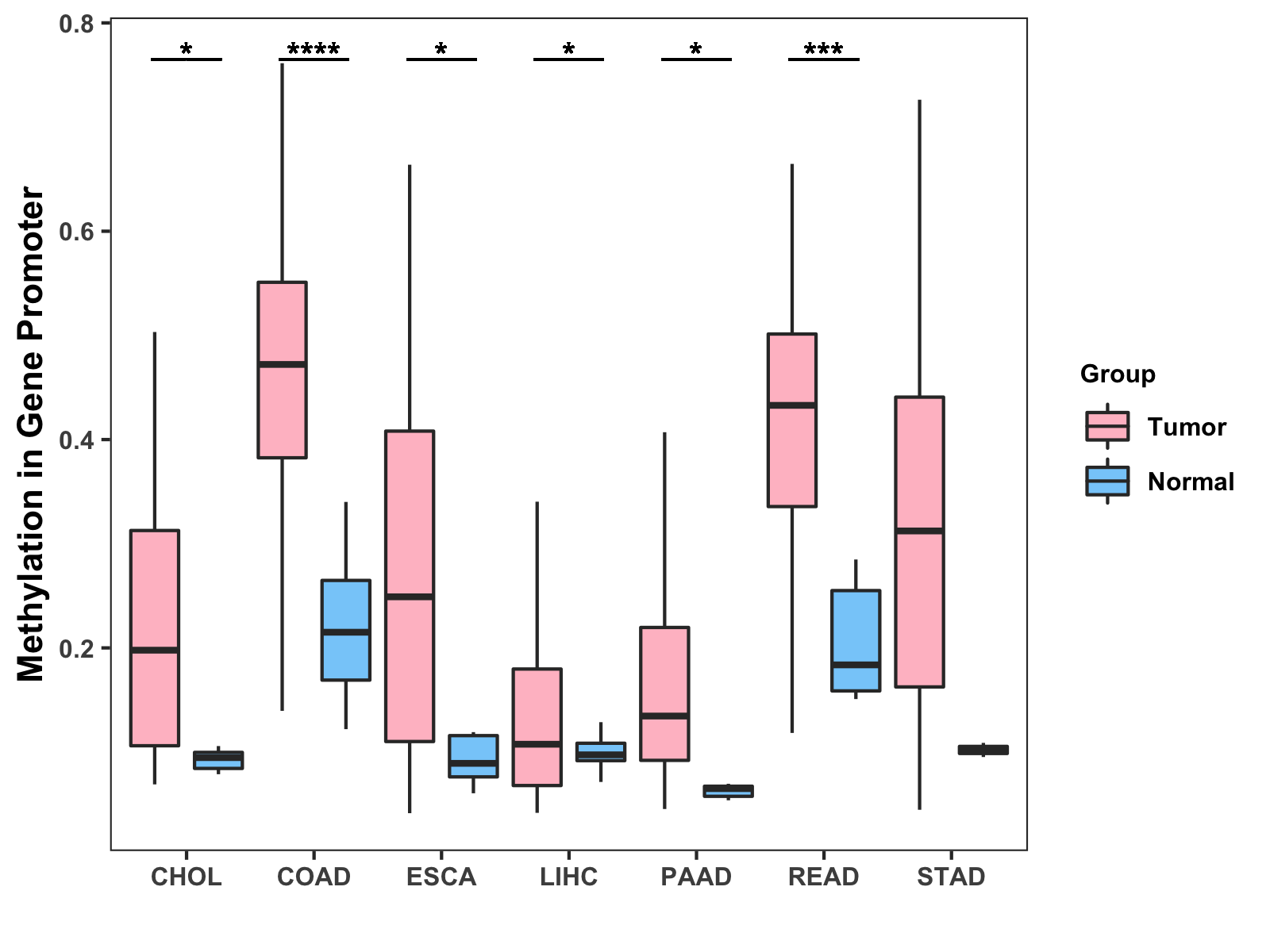 Boxplot of All Gastrointestinal Cancer ( * : 0.01-0.05 , ** : 0.005-0.01 , *** : 0.0001-0.005 , **** : < 0.0001 ) |