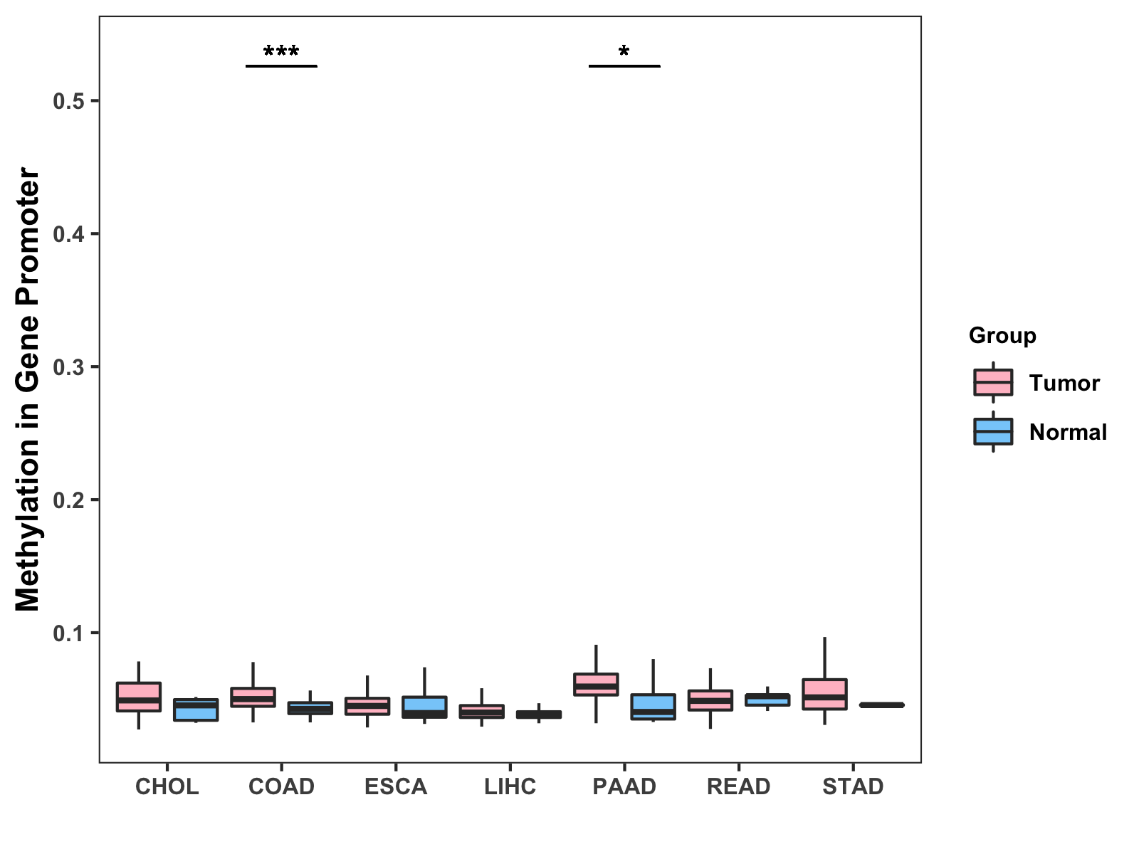 Boxplot of All Gastrointestinal Cancer ( * : 0.01-0.05 , ** : 0.005-0.01 , *** : 0.0001-0.005 , **** : < 0.0001 ) |
