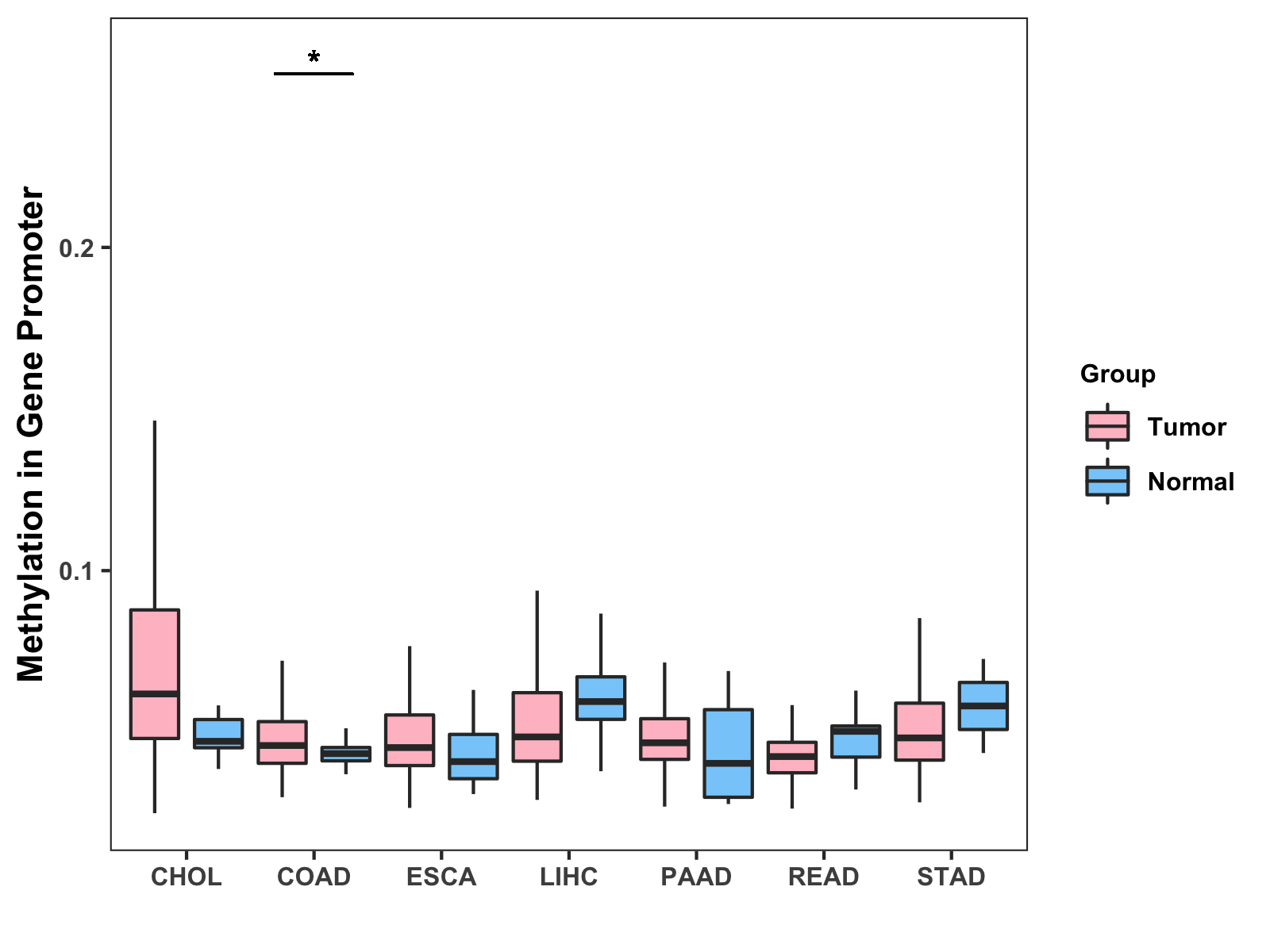 Boxplot of All Gastrointestinal Cancer ( * : 0.01-0.05 , ** : 0.005-0.01 , *** : 0.0001-0.005 , **** : < 0.0001 ) |