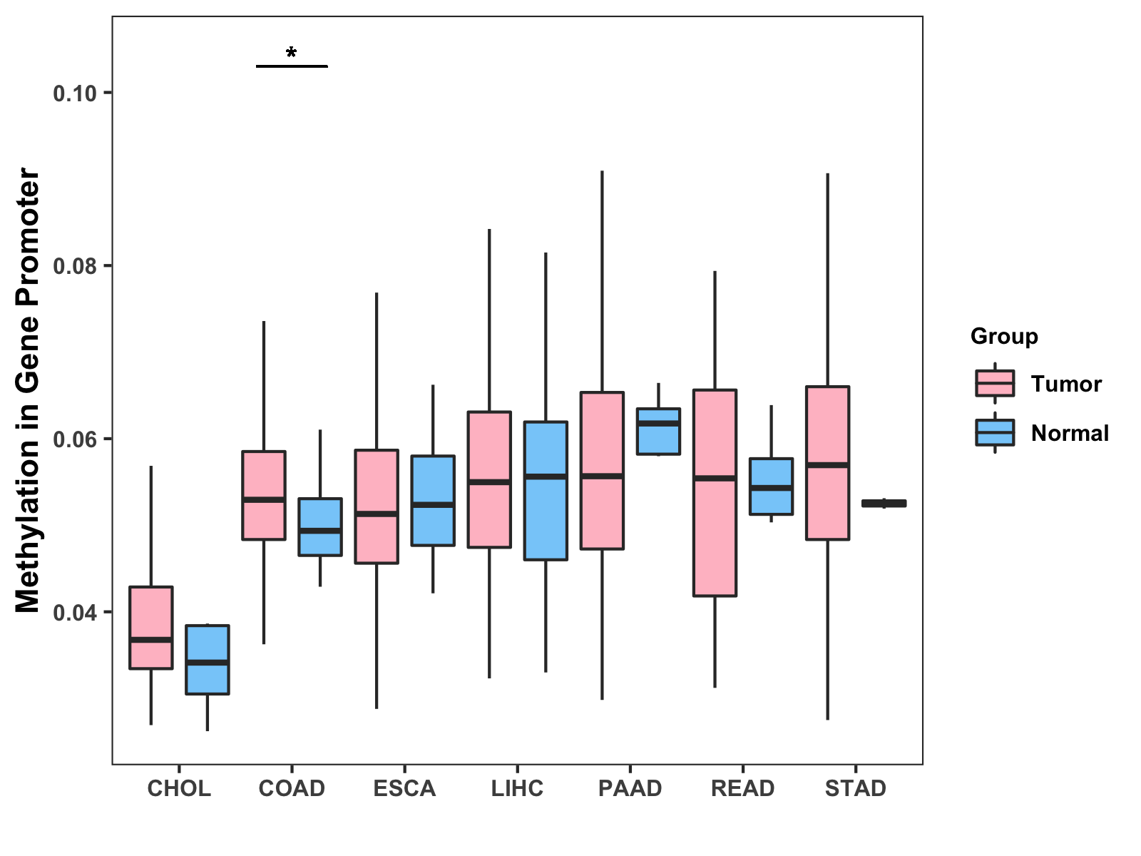 Boxplot of All Gastrointestinal Cancer ( * : 0.01-0.05 , ** : 0.005-0.01 , *** : 0.0001-0.005 , **** : < 0.0001 ) |