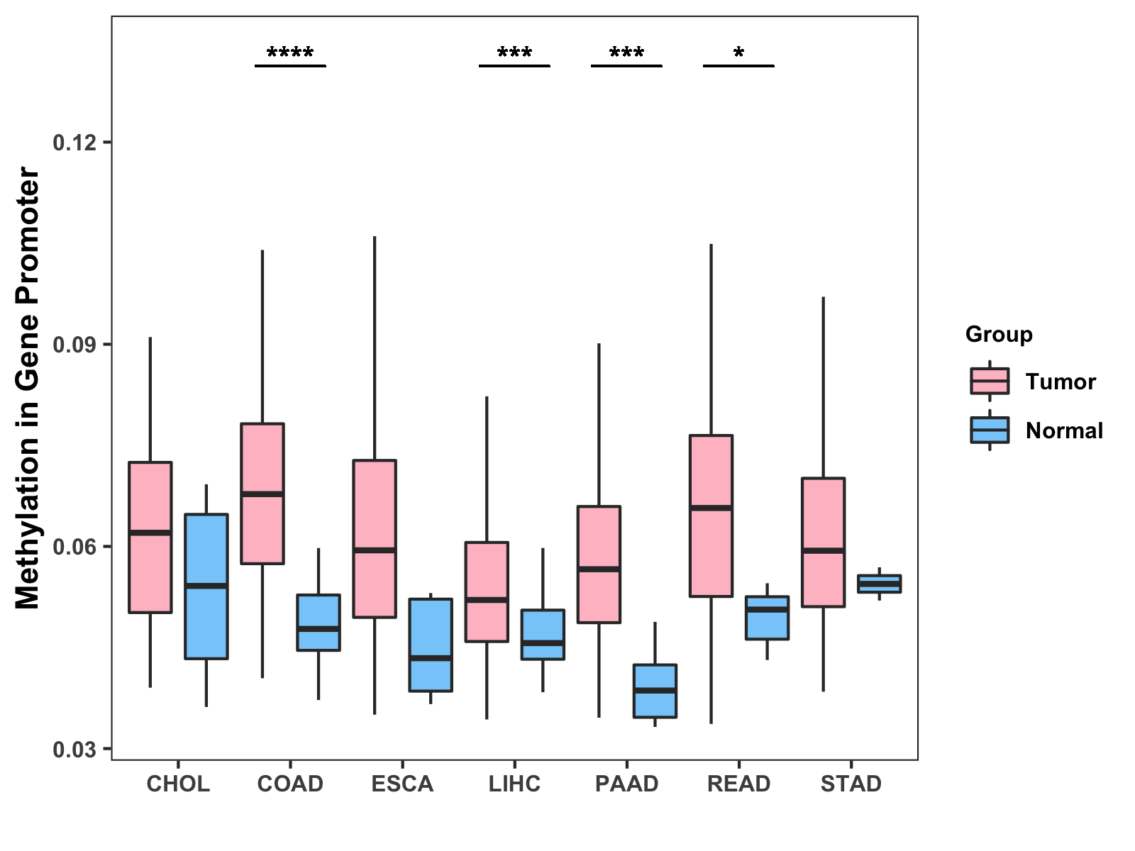 Boxplot of All Gastrointestinal Cancer ( * : 0.01-0.05 , ** : 0.005-0.01 , *** : 0.0001-0.005 , **** : < 0.0001 ) |