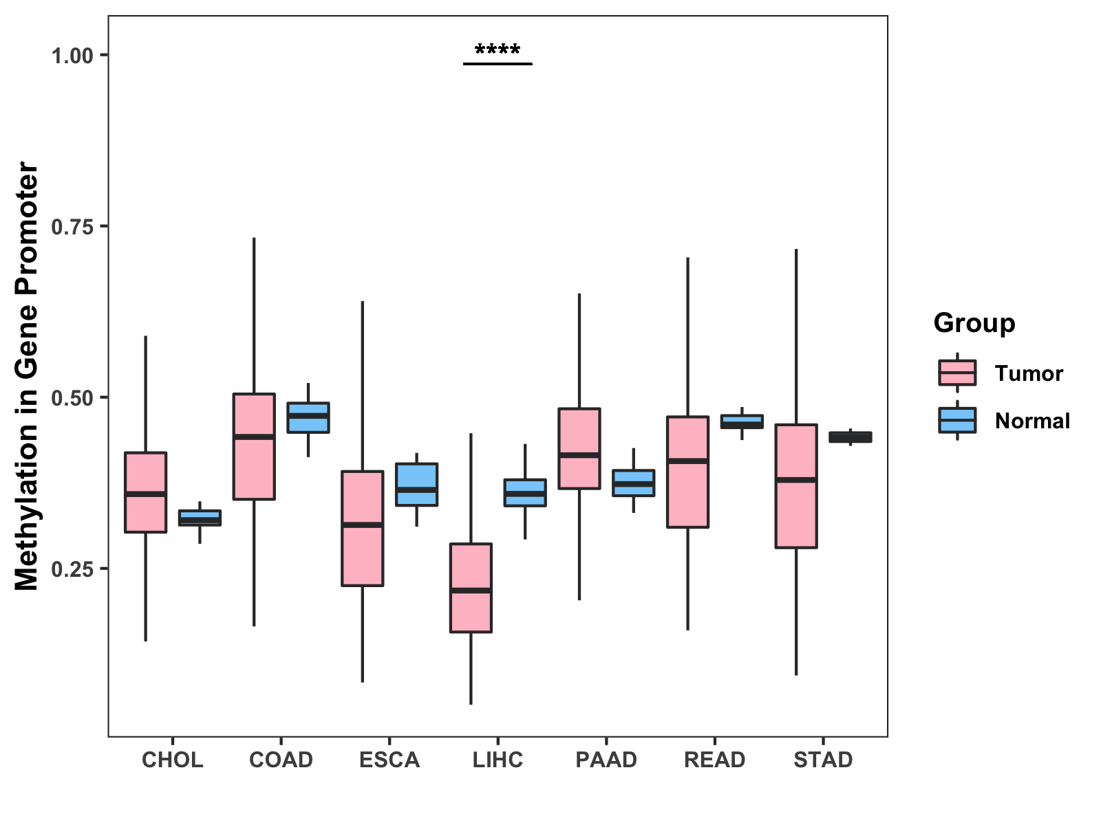 Boxplot of All Gastrointestinal Cancer ( * : 0.01-0.05 , ** : 0.005-0.01 , *** : 0.0001-0.005 , **** : < 0.0001 ) |