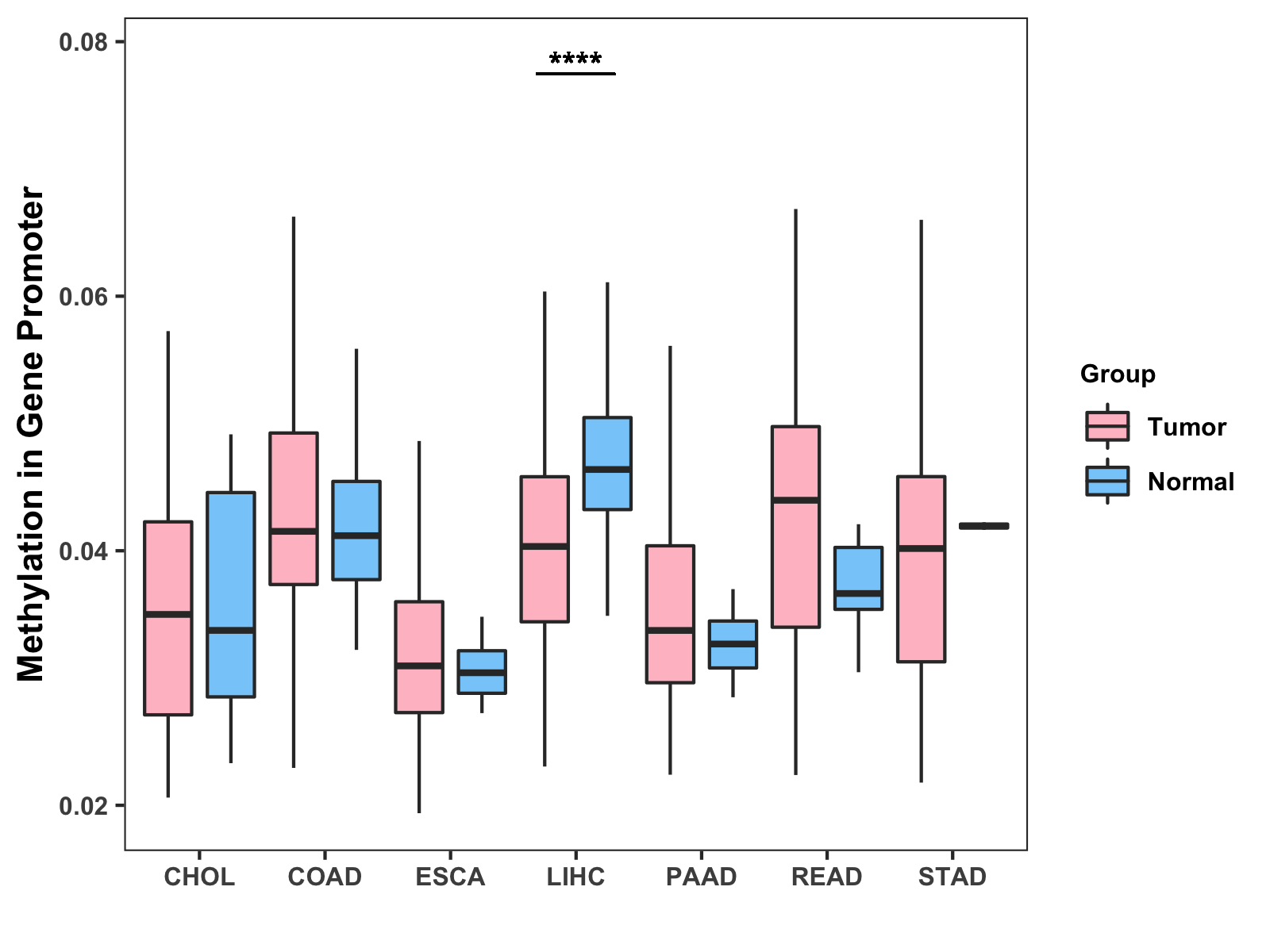 Boxplot of All Gastrointestinal Cancer ( * : 0.01-0.05 , ** : 0.005-0.01 , *** : 0.0001-0.005 , **** : < 0.0001 ) |