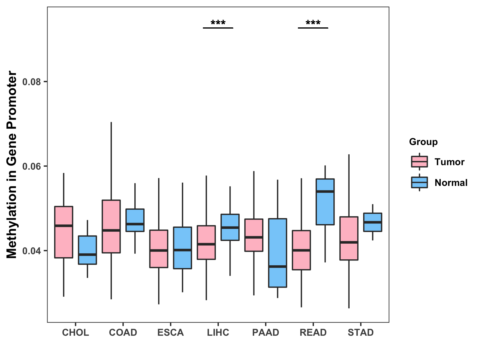 Boxplot of All Gastrointestinal Cancer ( * : 0.01-0.05 , ** : 0.005-0.01 , *** : 0.0001-0.005 , **** : < 0.0001 ) |
