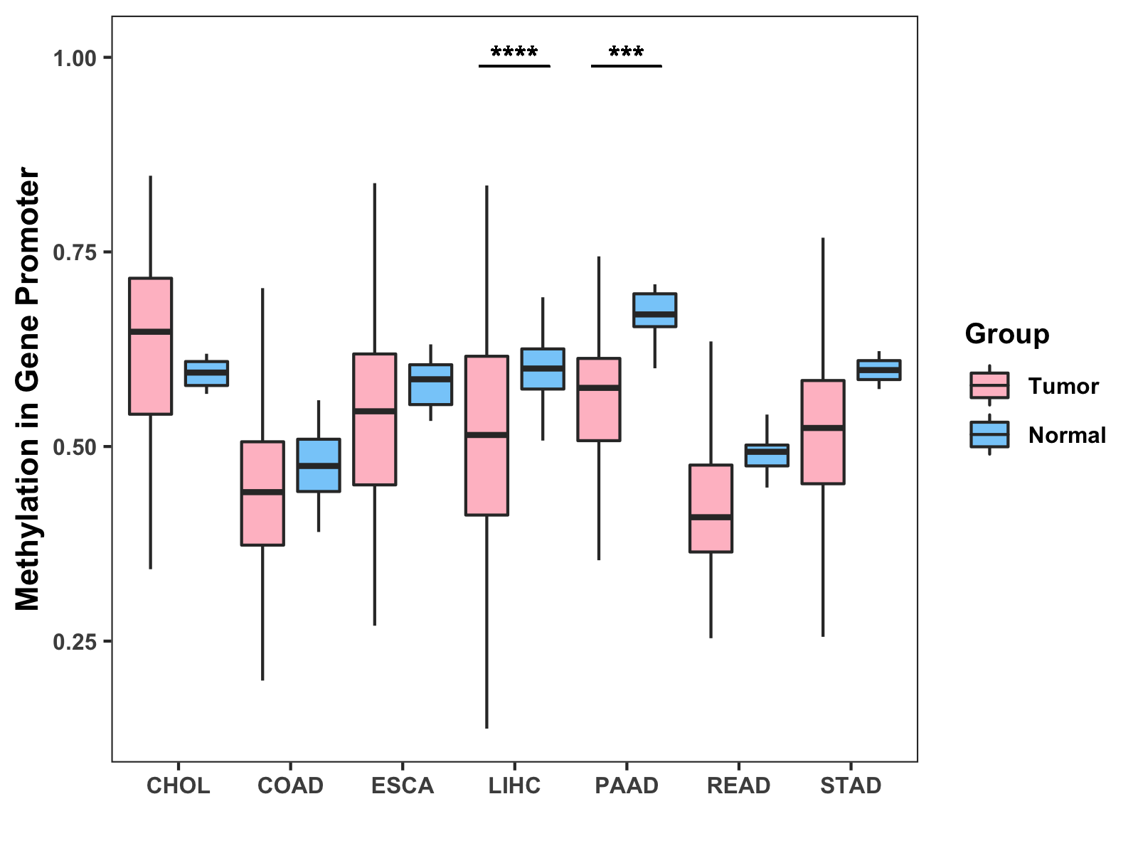Boxplot of All Gastrointestinal Cancer ( * : 0.01-0.05 , ** : 0.005-0.01 , *** : 0.0001-0.005 , **** : < 0.0001 ) |