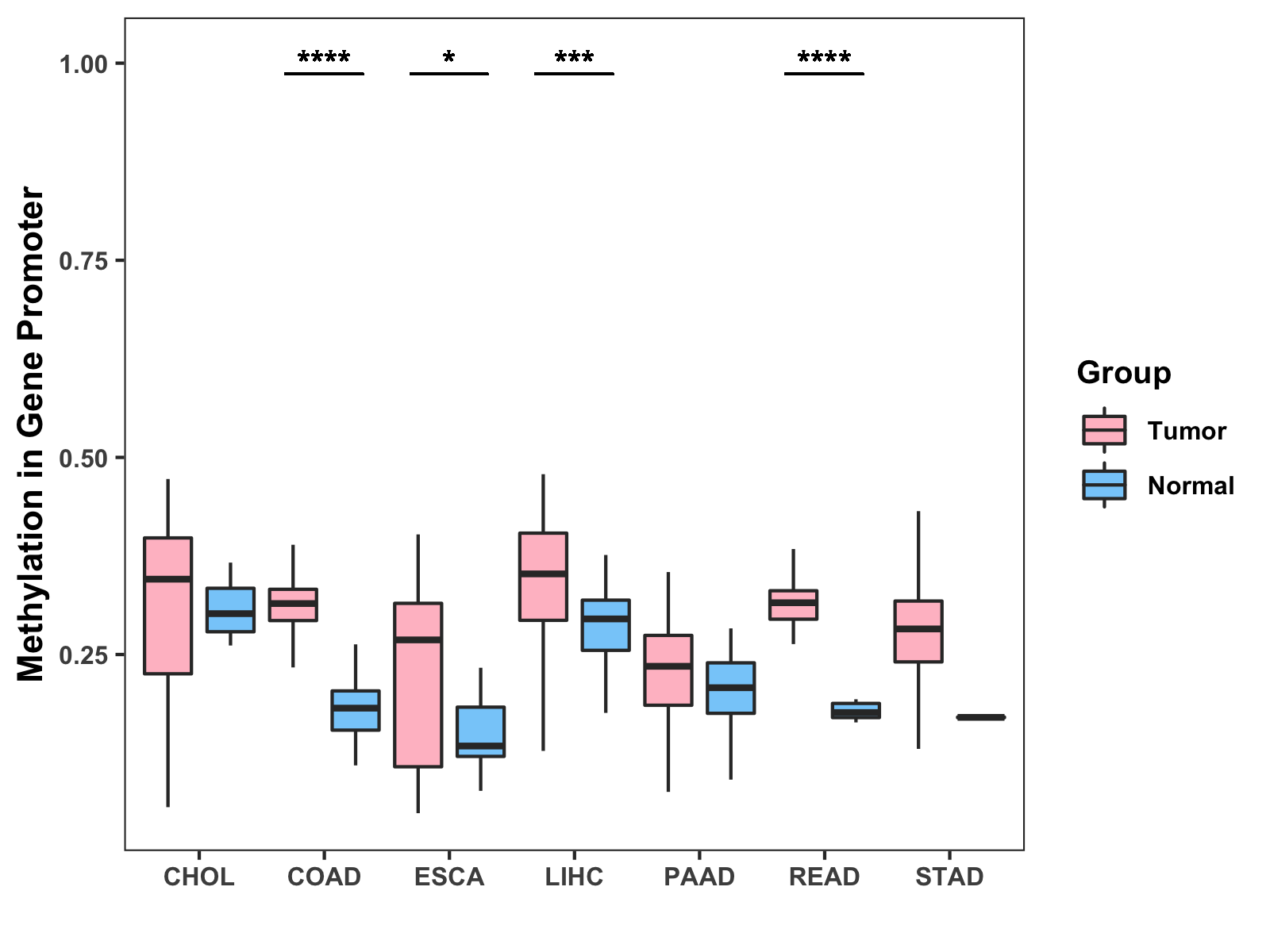 Boxplot of All Gastrointestinal Cancer ( * : 0.01-0.05 , ** : 0.005-0.01 , *** : 0.0001-0.005 , **** : < 0.0001 ) |