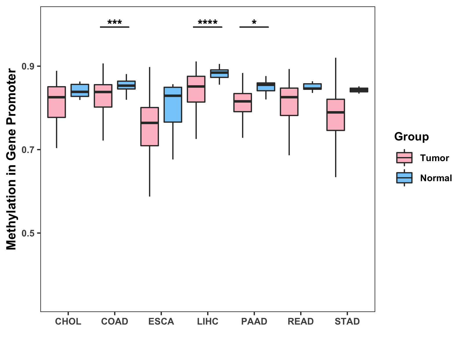 Boxplot of All Gastrointestinal Cancer ( * : 0.01-0.05 , ** : 0.005-0.01 , *** : 0.0001-0.005 , **** : < 0.0001 ) |