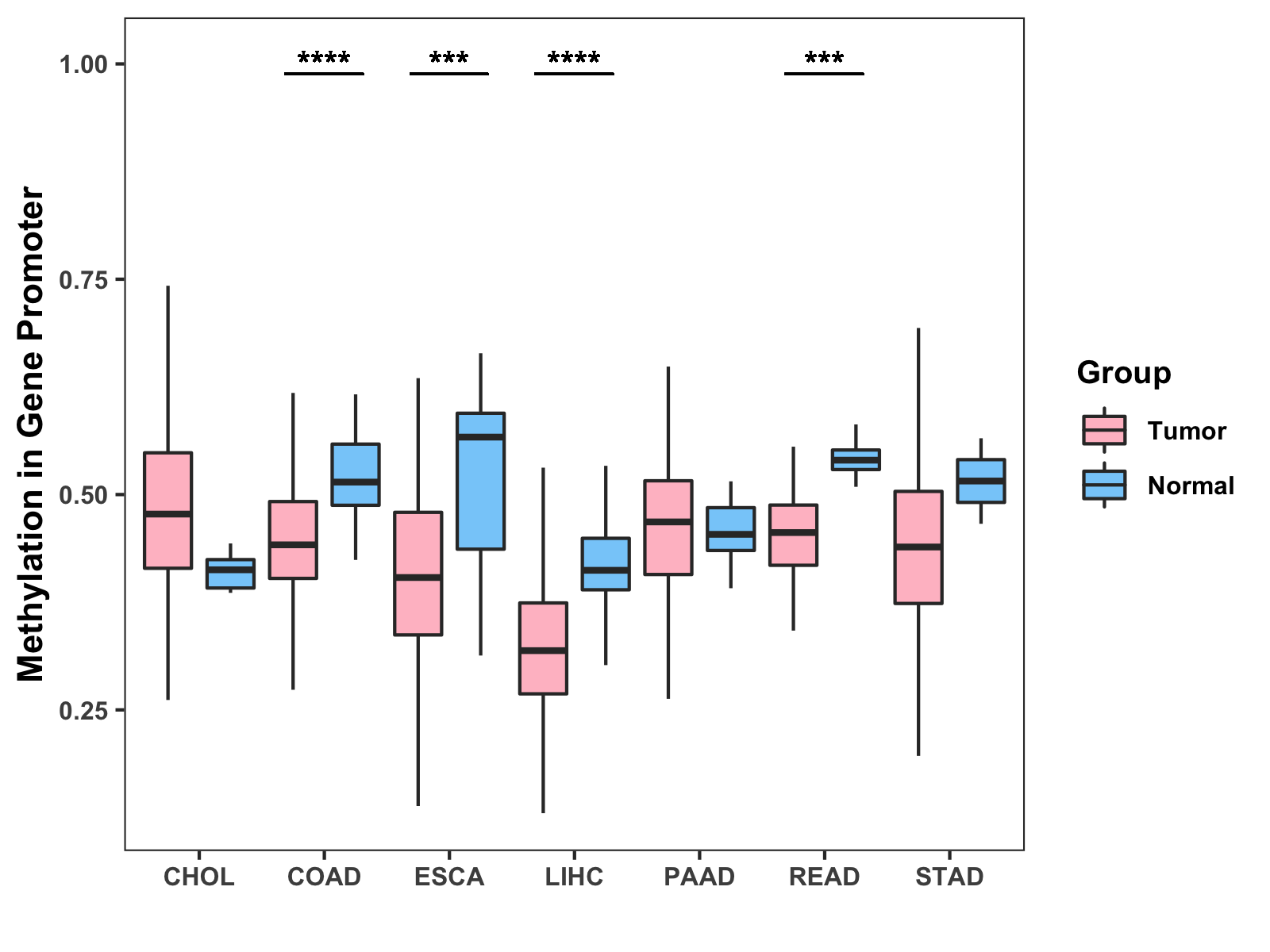 Boxplot of All Gastrointestinal Cancer ( * : 0.01-0.05 , ** : 0.005-0.01 , *** : 0.0001-0.005 , **** : < 0.0001 ) |
