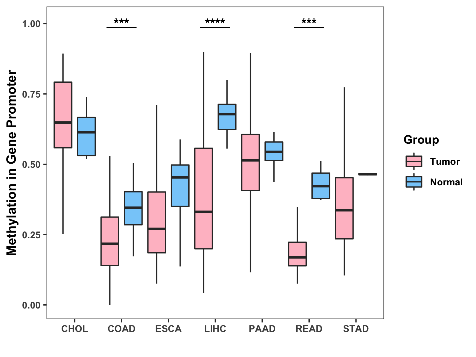 Boxplot of All Gastrointestinal Cancer ( * : 0.01-0.05 , ** : 0.005-0.01 , *** : 0.0001-0.005 , **** : < 0.0001 ) |